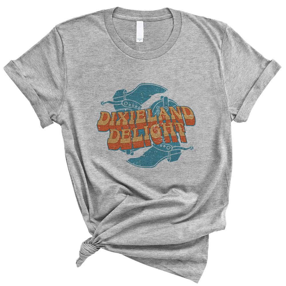 Rock out to the sounds of Dixieland with this country-inspired apparel design! Get ready to hit the dance floor and two-step your way into a "Delight"-ful night! (Yee-haw!) Printed on a Unisex Crewneck Tee 5.4oz, 90% Ring-Spun Cotton / 10% Polyester. Printed in the USA Our eco-friendly water-based ink prints directly into our shirt fibers for a smooth feel that provides a less vibrant, lived-in look. (No cracking or peeling like screen printing or iron-on transfers) For best results, wash inside out and on a gentle cycle in cold water. This listing is for our Dixieland Delight Shirt