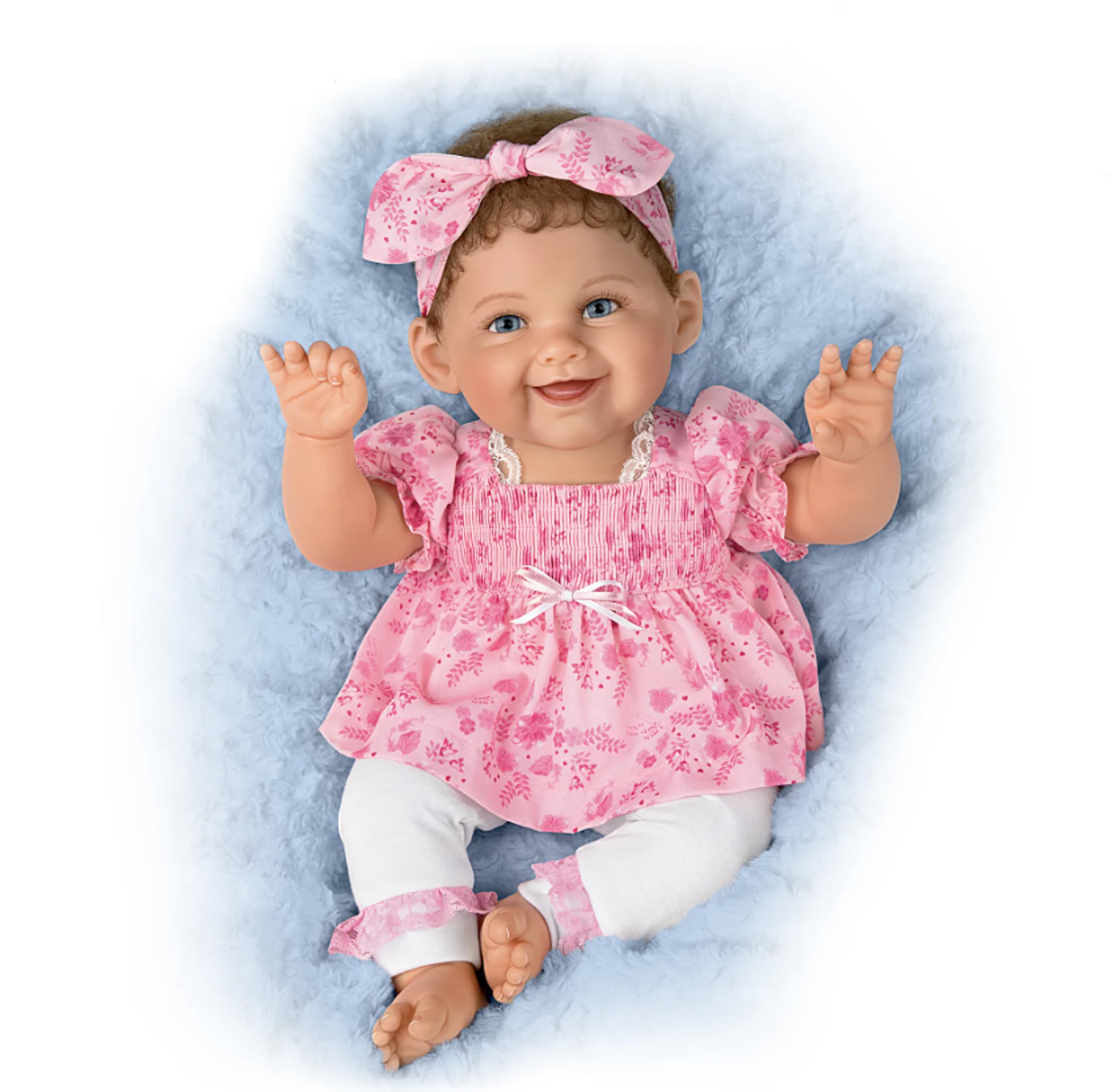 INTERACTIVE FEATURES: Touch-activated doll that delightfully giggles or tenderly says "Mama" when touched, creating magical moments with this 19-inch collector's edition AUTHENTIC DESIGN: Masterfully crafted by renowned artist Ping Lau with RealTouch vinyl, featuring plump cheeks, smiling lips, and detailed fingers and toes LIFELIKE DETAILS: Soft, wavy hand-rooted brown hair, weighted cloth body for realistic feel, and poseable design for various cuddling positions PREMIUM OUTFIT: Custom-designed ensemble includes floral print shirt with pink ribbon and French lace trim, white pants with pink lace, and matching knot headband SPECIFICATIONS: Measures 19 inches long, requires 3 AA batteries (not included), features light baby powder scent, not intended for children under 6 Introducing the Emma Grace's First Words Baby Doll by Ashton-Drake, a remarkable 19-inch collector's edition that captures precious childhood moments. Created by Master Doll Artist Ping Lau, this touch-activated doll responds to your gentle touch with delightful giggles or the heartwarming word "Mama." Crafted in RealTouch vinyl, every detail from her plump cheeks to her tiny fingernails exhibits stunning realism. Her soft, wavy brown hair is hand-rooted for a natural feel, while her weighted cloth body allows for perfect cuddling positions. Emma Grace comes dressed in an adorable ensemble featuring a floral print shirt with pink ribbon and French lace accents, white lace-trimmed pants, and a matching headband. The doll even features a light baby powder scent for added realism. This poseable collector's piece requires 3 AA batteries (not included) and includes a Certificate of Authenticity. Not intended for children under 6.