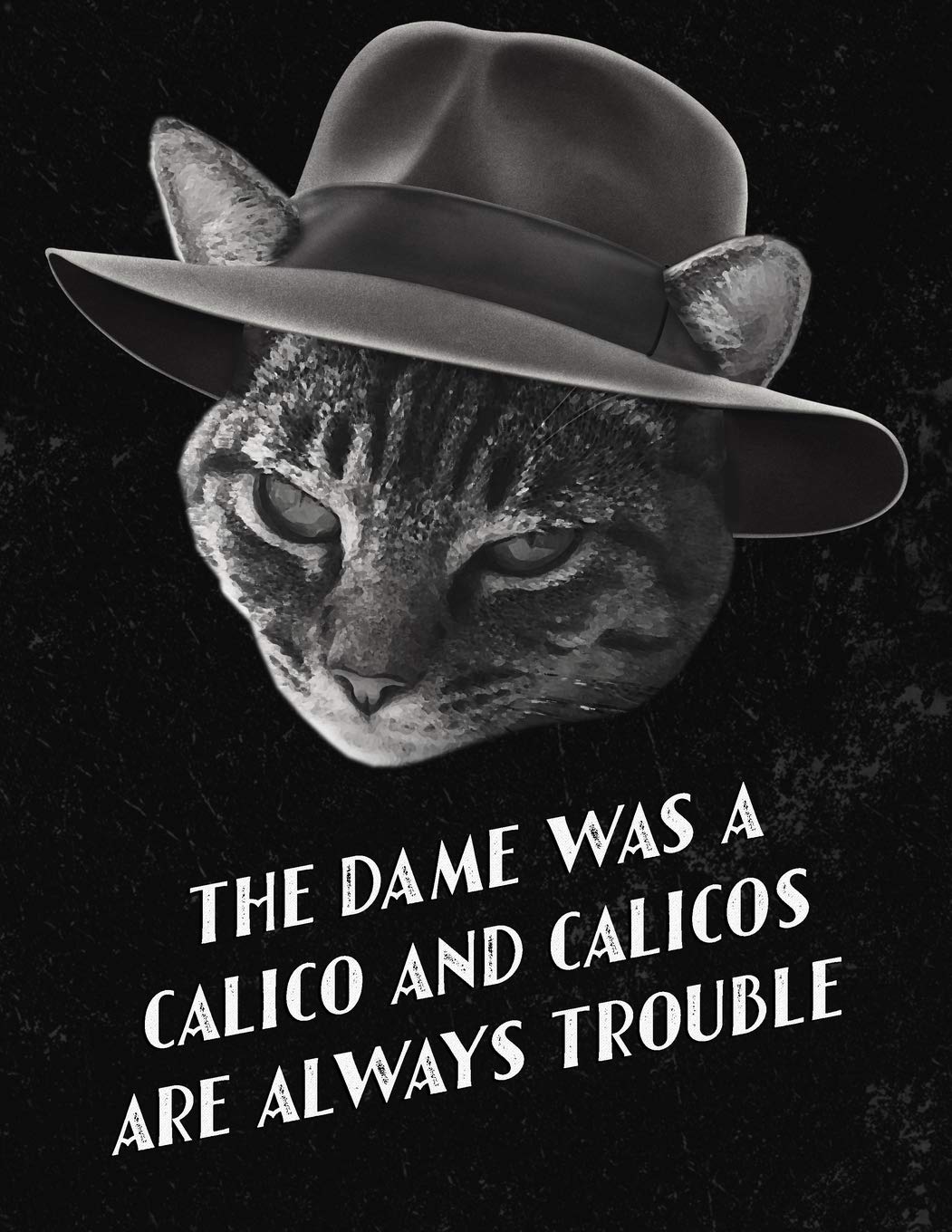 The Dame was a Calico and Calicos are always trouble Novelty Film Noir Cat themed notebook. Features a cool cat as a film noir detective with kitty troubles. The quotation sounds like a tough-guy cat might say. Capture all your swell ideas and notes in this convenient notebook, journal, or composition book. You'll be the talk of the town, as they say.Are you, at heart, a hard-boiled detective? Running low on your nine lives? Wear gum on your shoes? Get this unique Cat Noir notebook and all the swell dames won't be able to resist taking a gander at your feline features.Large wide-ruled 8.5 x 11 inch size with 110 pages (55 sheets front and back).