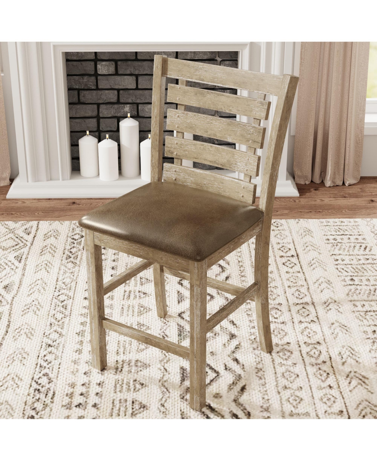 Elevate your dining space with this set of 2 counter height dining chairs, designed with a rustic farmhouse charm and a modern touch. Crafted from solid wood, these chairs feature a distressed finish that brings warmth and character to any kitchen or dining room. The ladder back design and horizontal slatted backrest add a touch of contemporary style, making them a versatile addition to any decor. Whether you're enjoying family meals or entertaining guests, these sturdy, comfortable chairs provide the perfect seating solution.