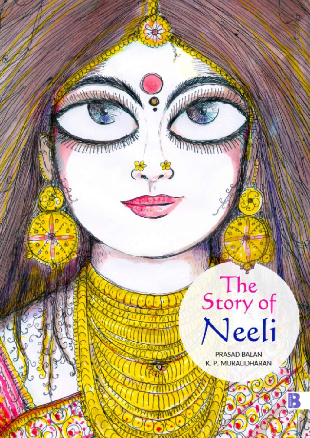 Neeli’s story is the most famous ‘yakshi katha’ in Kerala. It unfurls through two incarnations. In the first incarnation, it is about Lakshmi the temple dancer, a ‘Devadasi’ of Ammappan Kovil (temple) of Pazhakainallur near Salem, in Tamilnadu.Enticed by her beautiful lasya dance (slow, enchanting and graceful movement), a ‘Nambi,’ (caste) Velavan by name, falls in love with her. Her greedy mother, after winning over all his wealth treacherously, forbades him from meeting her daughter.Lakshmi who goes in search of Velavan, who has gone into the forest after losing all his wealth, was brutally murdered by him...In her second incarnation, she takes rebirth as the daughter of the Chola King Chempian. she kills Velavan, who has taken rebirth as Ananthan, a ‘Vaniyan’ (caste), and fulfill her thirst for revenge for his treachery in their previous birth...She rages on and on with wrath till she finally relents to the pleadings of Avaya at Muppandal and mellows down. With temperance and a mature mind, she settles down there, as Muppandal Devi...The story of Neeli finds its place even today in ‘Vill pattu’, a folk art form of a prominent branch of the Thekkan Pattukal(southern folk songs) of Kerala.‘Vill pattu’ is an important ritual art form in the ‘Amman Kovils’ (amman temples) of Kerala and Tamilnadu, which follow the Dravidian culture of worshipping Mother Goddesses.The songs are sung by striking a beat on the ‘Villu’, a giant bow like musical instrument; perhaps the longest musical instrument in the world.Neeli has been re-invented in various art forms like drama and cinema. In many of these, deviating from the original character, Neeli has been depicted as a heinous spirit, which causes harm to innocent people, tearing open their chests and drinking their blood. This book presents before children, a true picture of Neeli, through graphic illustrations, on the tenets of the mural art, indigenous to Kerala.