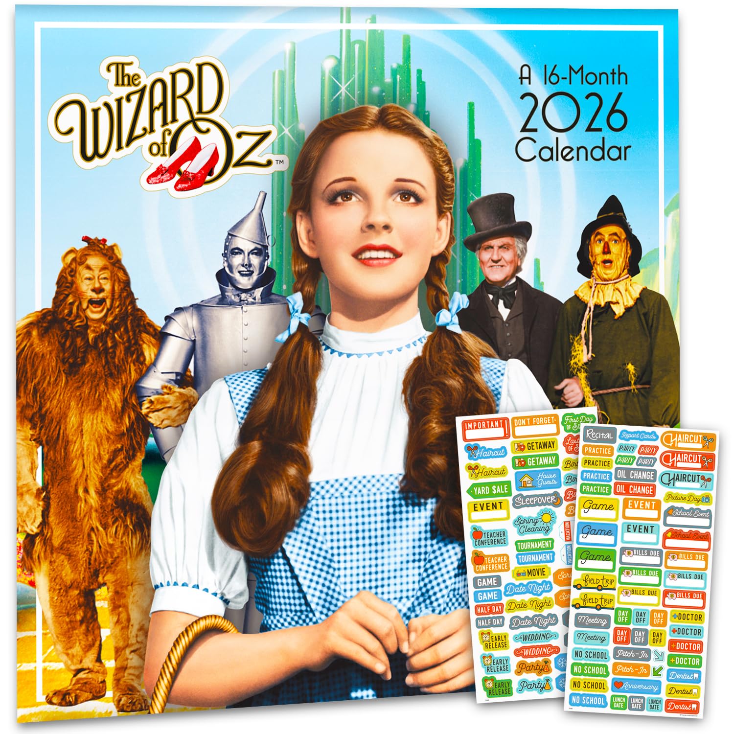 Follow the yellow brick road to perfect planning with the Wizard of Oz wall calendar! It’s got brains, heart, courage—and plenty of room to write your appointments. Deluxe The Wizard of Oz 2026 Wall Calendar Bundle with Calendar Reminder Stickers. This 2026 Wizard of Oz calendar is printed on premium heavyweight deluxe paper. Large grids to mark appointments and events. Observes major holidays and moon phases. This Wizard of Oz 2026 wall calendar measures 12 x 12 inches closed and 12 x 24 inches opened. Includes an individually wrapped pack of calendar reminder stickers. Over 100 calendar stickers to mark school events, doctor appointments, dates, vacations and more! This 12 x 12 inch calendar features an opening spread with a beautiful four month (September-December 2025) calendar to plan the last four months of the year and prepare for 2026. A year of stunning Wizard of Oz images. Officially licensed Wizard of Oz merchandise. Perfect as The Wizard of Oz gifts, office supplies and desk accessories. Follow the yellow brick road to perfect planning with the Wizard of Oz wall calendar! It’s got brains, heart, courage—and plenty of room to write your appointments. Deluxe The Wizard of Oz 2026 Wall Calendar Bundle with Calendar Reminder Stickers. This 2026 Wizard of Oz calendar is printed on premium heavyweight deluxe paper. Large grids to mark appointments and events. Observes major holidays and moon phases. This Wizard of Oz 2026 wall calendar measures 12 x 12 inches closed and 12 x 24 inches opened. Includes an individually wrapped pack of calendar reminder stickers. Over 100 calendar stickers to mark school events, doctor appointments, dates, vacations and more! This 12 x 12 inch calendar features an opening spread with a beautiful four month (September-December 2025) calendar to plan the last four months of the year and prepare for 2026. A year of stunning Wizard of Oz images. Officially licensed Wizard of Oz merchandise. Perfect as The Wizard of Oz gifts, office supplies and desk accessories.