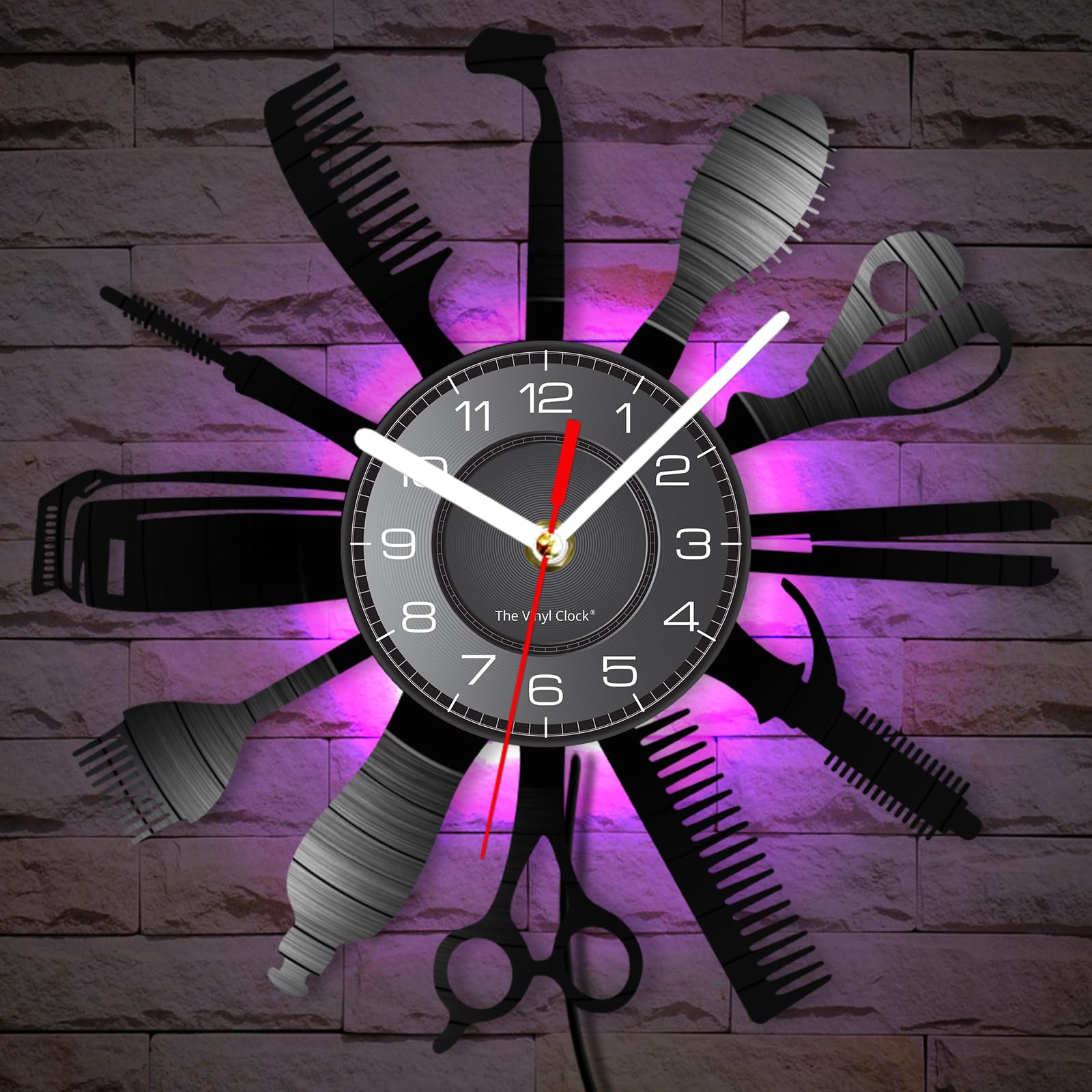 【7 Color Changes】-This salon decor wall clock can change 7 colors, you can adjust it as you like. The hair salon decor wall clock is about 12 inches and comes with a 70.8-inch cord. Barber signs for wall 【Silent Movement】-Our barber clock features high quality quartz sweep movement for keeping quiet and accurate, no more annoying ticking, which provides peaceful and comfortable moment. Cool gifts for barbers 【High-Quality Material】-The barbershop decor wall clock is cut from an actual vinyl record, a totally unique design. The center dial of the hair clock is made of thickened acrylic (not paper). The hair salon decor wall clock has a recess on the back for hanging 【Salon Decor For Hair Stylist】-Modern barber decor wall clock for hair room decor, kitchen, living room, bedroom, bar, man cave, bathroom, farmhouse, office, school etc. As white elephant gifts for adults, Christmas gifts, holiday gifts, birthday gifts for women, men, daughter, son, friends 【Thickened Package】-Each night light barber decorations wall clock is carefully checked before we send it out, and it is packed in thickened foam to ensure that the wall clock arrives intact - When you come home from a long day of work with a tired body, does a dark room make you feel lonely and scared? Relax, our LED night light wall clock can solve this problem, the warm light can make your home more cozy. It can also add a sense of ambiance to your home on special days. - Most people can't imagine that a vinyl record can make a clock, we did it! The unique design is eye-catching enough that it will be one of the brightest sights in your home. Creative wall clocks are the start of an interesting conversation! - The wall clock is made from real vinyl records and the clock face is thickened acrylic. This is an eco-friendly activity that you will be a part of. - Wall clock with high quality quartz movement, hands sweeping silent no ticking sound. Suitable for kid's bedrooms, offices and other places where quiet is needed. - Can be used as living room wall clock, bedroom wall clock, kitchen wall clock, office wall clock, bathroom wall clock, kids room wall clock, garage wall clock, man cave wall clock. Creative gifts for teachers, coaches, parents, family and friends. Specification: Material: Wall clock - vinyl Clock face - thickened acrylic Measure: 12 inch Color of LED: purple, red, blue, yellow, green, cyan, white Power supply mode: LED backlight - USB What will you get? LED wall clock * 1 Plug * 1 Each wall clock is carefully inspected before it is sent out and will be packed in foam padded packaging to ensure that it arrives in intact condition. Warm tips: Our wall clocks are cut from real vinyl records, so they all measure around 12 inches (depending on the theme of the wall clock).E19