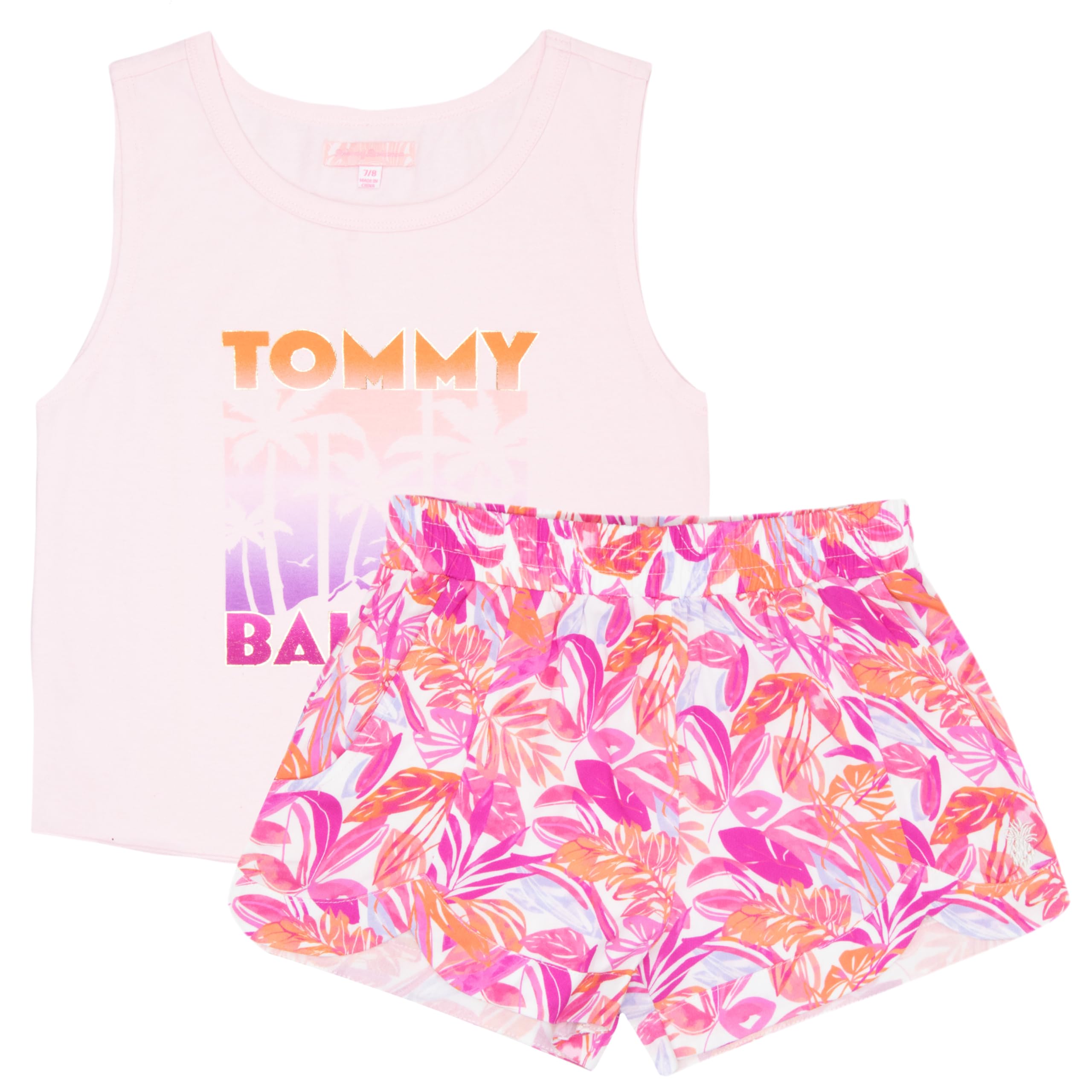 Live the Island Life: Our Tommy Bahama Girls 2-Piece Set includes an adorable tank top shirt and a pair of matching shorts, designed to create a coordinated, stylish look for girls Premium Quality: Made from lightweight and breathable materials, this outfit will keep your child cool on hot summer days. Perfect for active kids who need both comfort and style while out and about Great Gift: A great gift for birthdays, holidays, or special occasions, this set is a fun and practical choice for any young girl. Kids will love wearing this fashionable outfit everywhere they go! Easy Care: Machine washable for convenience, this set is designed to maintain its shape and colors wash after wash and is durable enough to handle frequent use during the summer months Versatile: Perfect for a variety of activities, whether it's for a trip to the park, a beach day, or just relaxing at home. Wear the pieces together as a set or mix and match with other pieces This Tommy Bahama Girls 2-Piece Set is a charming and stylish outfit that includes a tank top and matching shorts, creating a coordinated look for girls. The tank top features a cute graphic design with a tropical theme and the elastic waist shorts have an all over print floral pattern and side pockets. Crafted from a lightweight, breathable cotton blend material, this set keeps kids cool and comfortable even on the hottest summer days, offering the perfect balance of comfort and style for active little ones. It's an ideal gift for birthdays, summer holidays, or special occasions, and works great for family vacations or day trips, blending both fashion and practicality. Easy to care for, this machine washable set is durable enough for frequent wear. Versatile and ready for anything, it’s perfect for park outings, beach days, or lounging at home, allowing parents to effortlessly choose a complete outfit for their child.