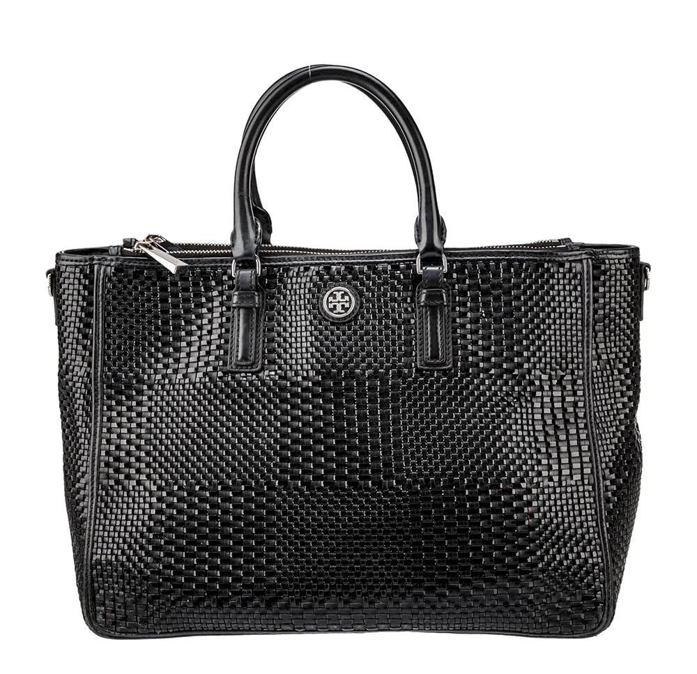 Introducing the Tory Burch Robinson Black Tote Basket Weave Saffiano Leather Large Handbag – your perfect blend of style and functionality! Elevate your fashion game with this iconic piece featuring the signature Tory logo in shiny golden hardware. Crafted from structured black saffiano leather, this tote exudes elegance and durability, ensuring it stands the test of time.