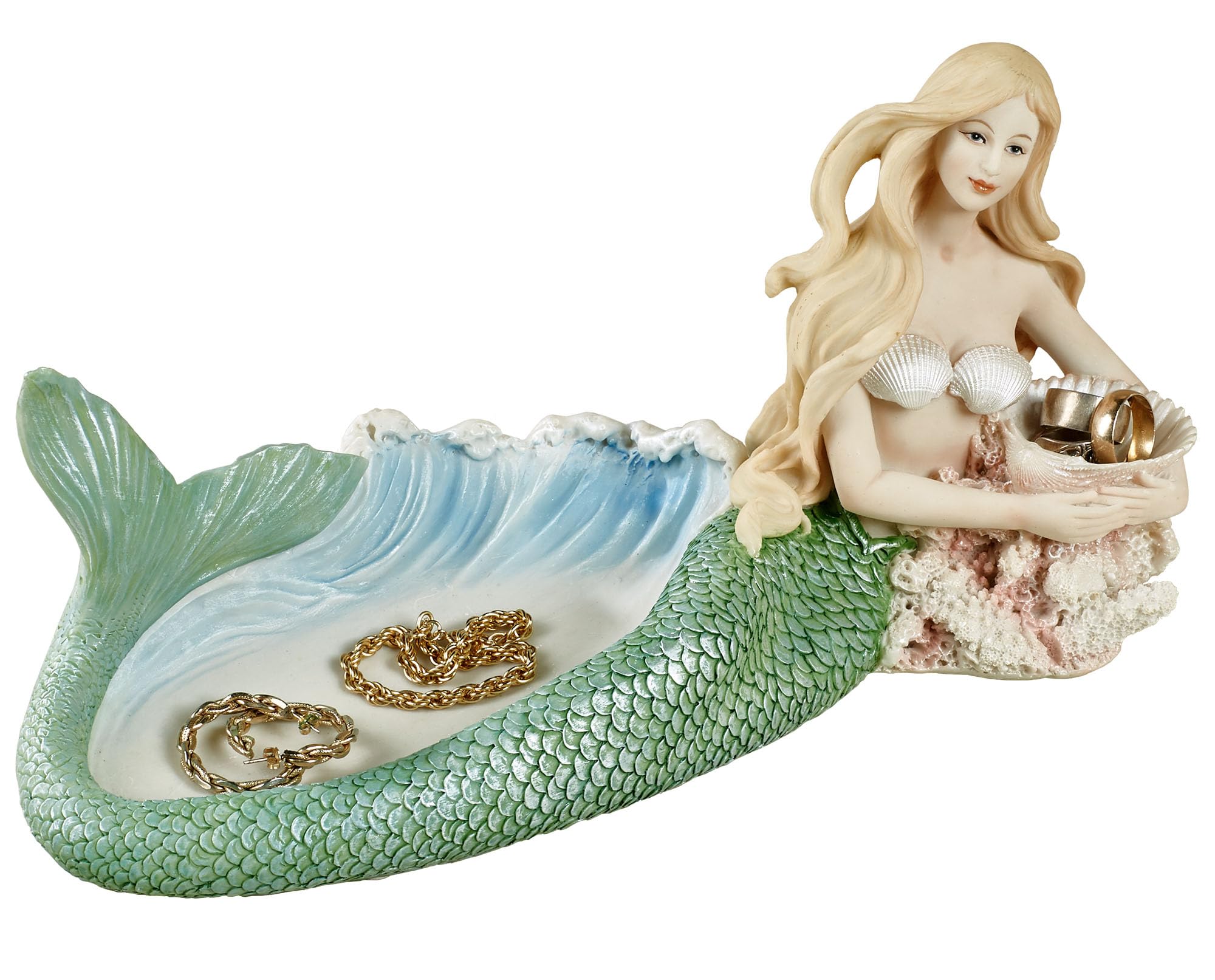 π§ββοΈ SIGNATURE DESIGN π§ββοΈ - Designed with you in mind, this sweet mermaid soap dish is one of our exclusives, meaning you will not find it anywhere else. She will add beauty to your home, pair her with other mermaid decor to have your own fantasy land. Without a doubt in our heart, we believe you are worthy of art as unique, wonderful and beautiful as you. Decorate your household atmosphere with brilliant distinction. π§ββοΈ SIGHTWORTHY EXPERIENCE π§ββοΈ - Imagine for a moment, strolling through the hallways, relaxing in the bedroom, or doing dishes at your kitchen sink and before your eyes is an extraordinary mermaid holder. What are otherwise normal activities, now become a series of life-changing moments, right within your home. Guests will comment enthusiastically, above all, you will be inspired for a long time to come. π§ββοΈ SOPHISTICATED CRAFTSMANSHIP π§ββοΈ - Aristelle the mermaid is perfectly content to lounge against a piece of coral at the water's edge as she watches ships at sea. This detailed resin mermaid has a long green tail to hold your soap or jewelry, flowing blonde tresses, and a large scallop shell in her arms to hold your earrings, rings, or other small items. π§ββοΈ SPLENDID GIFT CHOICE π§ββοΈ - Whether it is your significant other, close friend dear to the heart, or the child in your life, something like this is sure to bring them delight. Watch them receive warmly, thankful for someone in their life as thoughtful as you. This sweet little mermaid will be loved by all who receive her. π§ββοΈ SPECIFICATIONS & PRODUCT CARE π§ββοΈ - Beach themed soap dish measures 12 inches wide by 6 inches deep by 6 inches high. For the best possible experience dust with a soft, dry cloth. Do not use chemicals, polishes, or abrasives. Aristelle the Mermaid is perfectly content to lounge against a piece of coral at the water's edge as she watches ships at sea. This detailed resin mermaid has a long green tail to hold your soap or jewelry, flowing blonde tresses, and a large scallop shell in her arms to hold your earrings, rings, or other items. Measures 12"Wx6"Dx6"H. The Aristelle Mermaid Accent is resin. Dust with a soft, dry cloth. This item is our exclusive! Great bathroom or vanity accent Convenient accessory to have by your sink Accent can hold your soap and rings Detailed blonde mermaid Iridescent colors Perfect for beach themes Measures 12"W overall