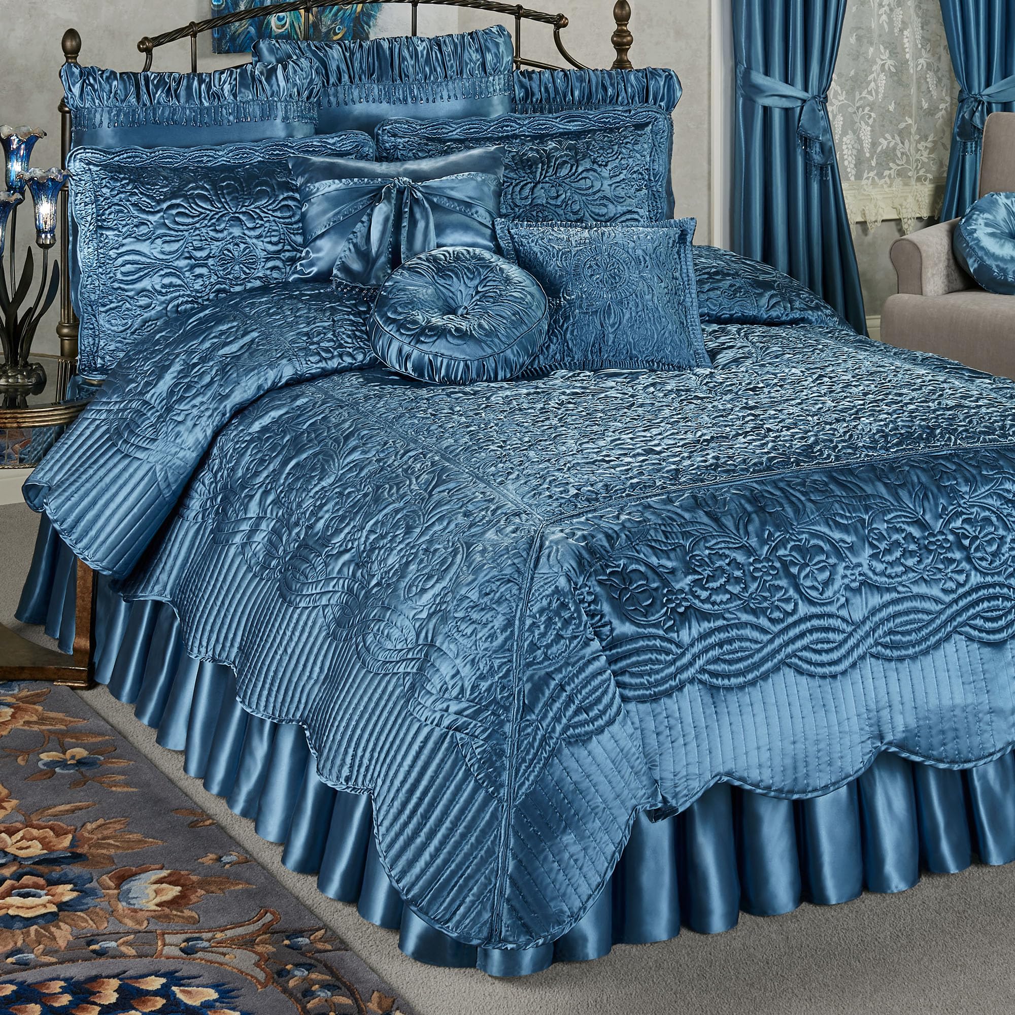 Sapphire Coverlet Set includes coverlet, bedskirt, and shams Coverlet is oversized to fit deep mattresses Meticulous hand-guided quilting Polyester satin material has a beautiful shimmer Exquisite bedding is machine washable Prima Bedding steals the spotlight! The sapphire, four-piece Prima California King Coverlet Set includes a coverlet, bedskirt, and two shams. Oversized, polyester satin coverlet has beautiful quilted motifs, scalloped bound ends, and quilted, color-matched cotton backing. Coverlet fill is cotton. Machine washable. Imported. Designed by Touch of Class(R)!