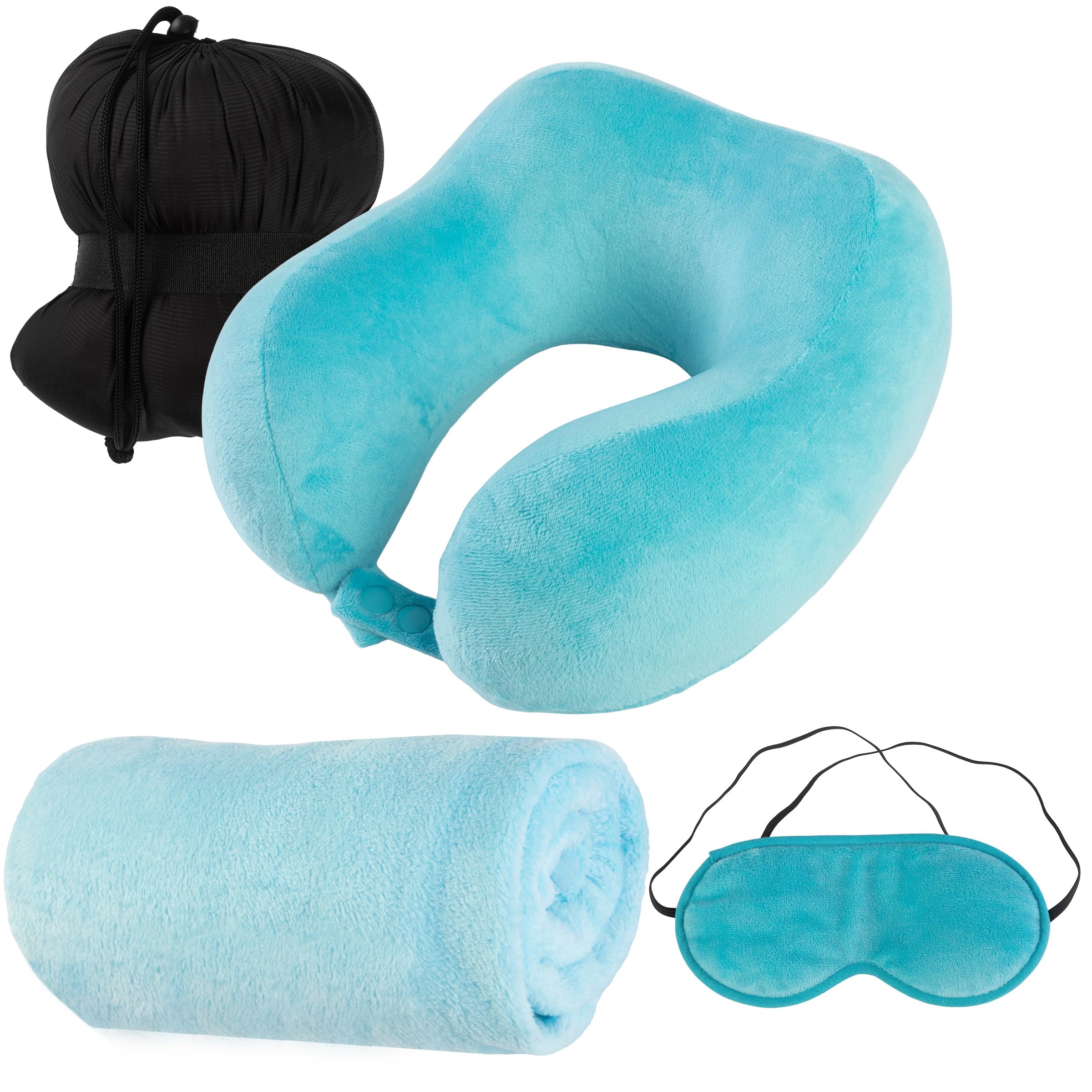 60% Cotton/ 40% Polyester 3-PIECE TRAVEL SET - Sleep comfortably while on the go with the airplane essentials kit that includes a travel neck pillow, fleece blanket, and plush eye mask to provide any traveler with premium comfort while riding in planes, trains, cars, and buses. COZY COMFORT - This plane pillow is made of firm, yet plush memory foam to help promote proper head alignment and provide 360-degree support to your neck whether you’re sitting at home watching TV or sitting on a plane for hours. CARRYING BAG INCLUDED - The travel pillow and blanket set comes with a storage bag for hands-free portability when traveling. Store the pillow or blanket in the carrying bag while on the go to help keep your travel accessories clean and organized. MACHINE WASHABLE - The soft fleece cover on the memory foam travel pillow is removeable, and the pillowcase and blanket are machine washable for your convenience. PRODUCT DETAILS - Materials: Memory Foam and Plush Fleece. Dimensions: Pillow: (L) 9” x (W) 9” x (H) 4.5”; Blanket: (L) 48” x (W) 40”; Eye Mask: (L) 8” x (W) 3.5”. 3-Piece-Set comes with one Neck Pillow, Blanket, and Eye Mask. Color: Pink.