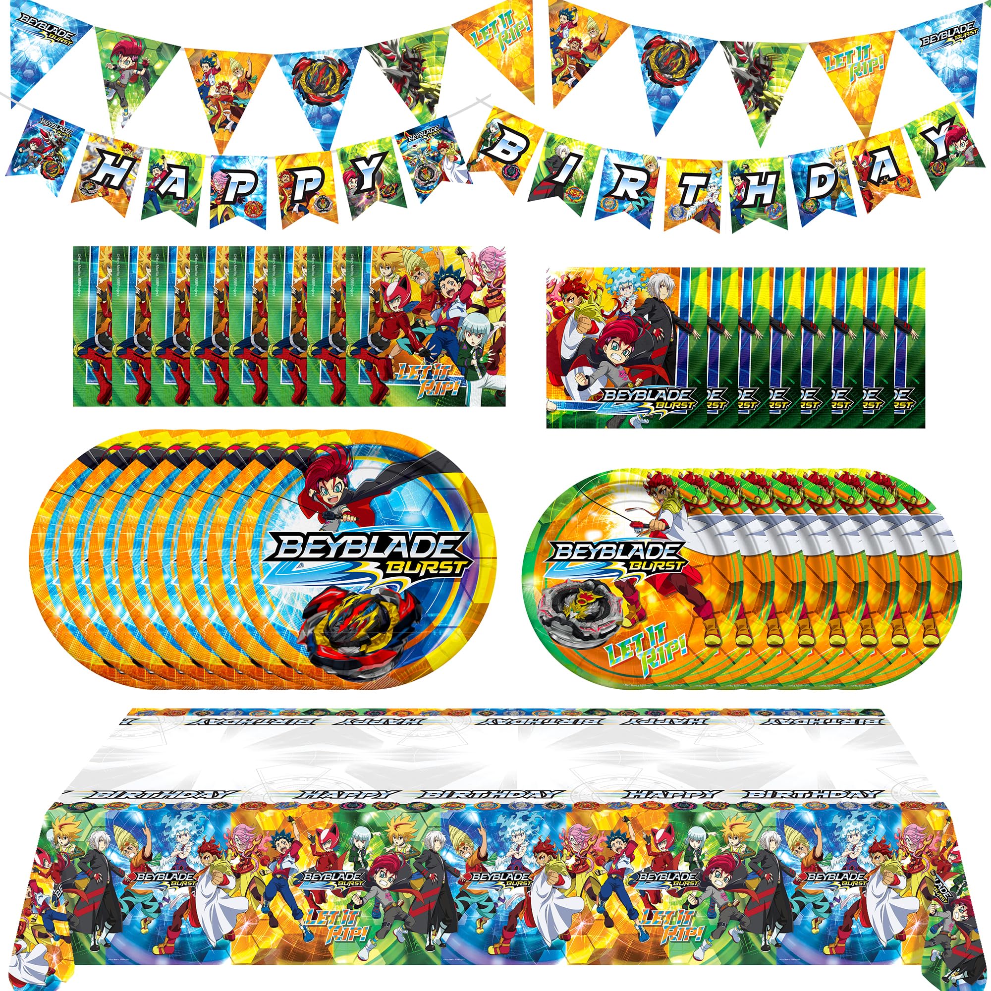 This set of BEYBLADE party decorations includes (2) tablecloth, (1) BEYBLADE birthday banner, (1) pennant BEYBLADE banner, (24) 7in dessert plates, (24) 9in BEYBLADE party plates, & (32) napkins. Gear up for an epic spinning battle with our BEYBLADE BURST party supplies set! Designed for BEYBLADE champions, this set includes everything you need for a thrilling BEYBLADE theme party. Host a party full of tournaments & competition with our complete set of BEYBLADE party decor! Simply place the BEYBLADE plates and napkins on the table for an unbelievable action packed celebration. There's no better way to celebrate than with our high-quality BEYBLADE party supplies decorations! With vibrant designs, our high-quality BEYBLADE decorations for kids party will bring the BEYBLADE stadium to life. Get ready to launch into action! Looking for even more BEYBLADE birthday party decorations? Check out the Treasures Gifted Amazon store for more products such as BEYBLADE cake topper, BEYBLADE backdrop, BEYBLADE cupcake topper & other BEYBLADE theme party decorations. We’ve Made Birthdays a Breeze with Our Complete Set of BEYBLADE Birthday Decorations!