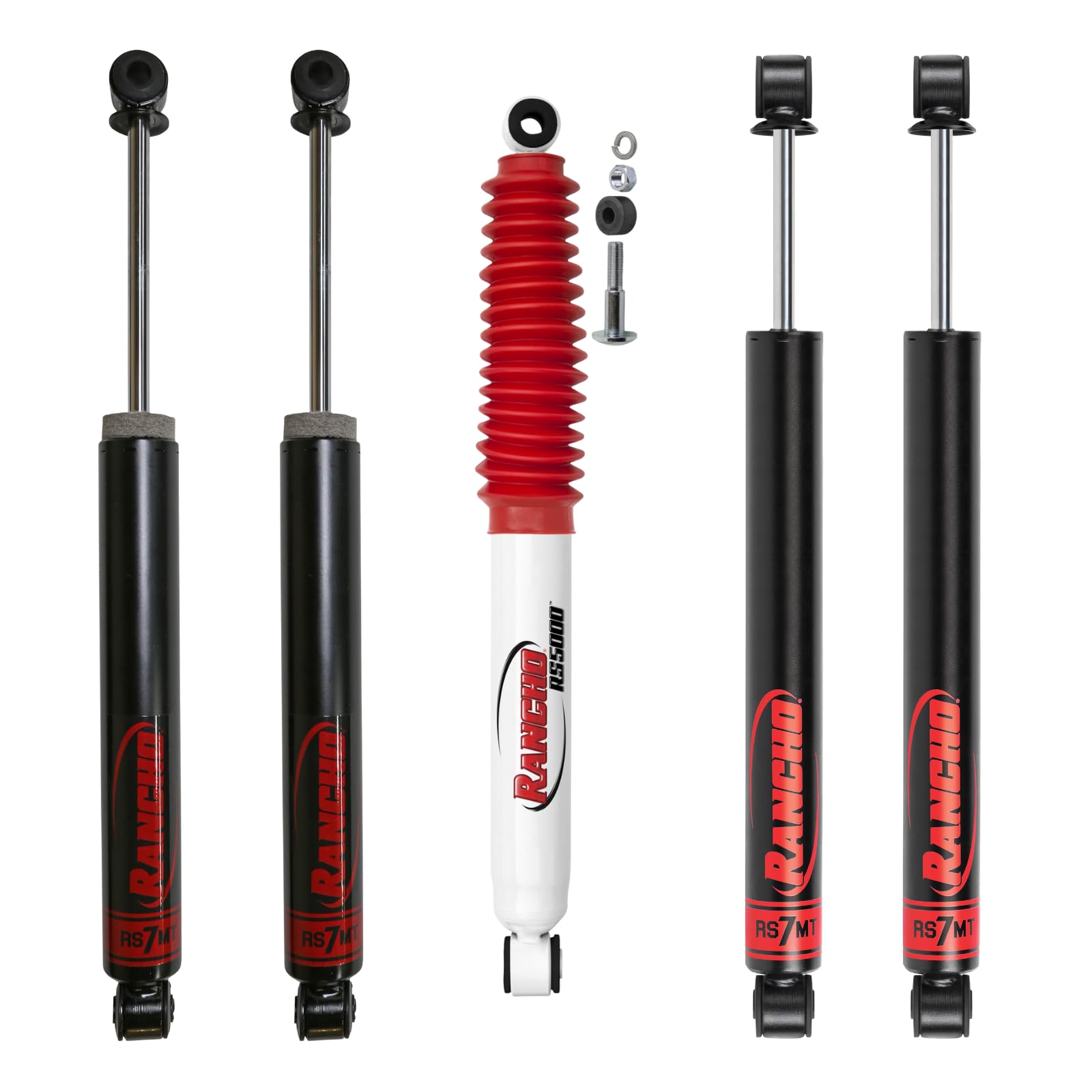 Vehicle Fitment: Compatible with 1999-2004 F250 and F350 Super Duty 4WD models with 0 inch lift excluding chassis cab models Enhanced Ride Quality: A smoother ride is provided with an internal rebound bumper and shouldered rubber bushings providing a reduction in noise, vibrations, and harshness while responsiveness improved with a PTFE-banded piston Reduces Fade: High pressure nitrogen gas minimizes the mixture of of air-to-oil reducing the damping fade and foaming creating a superior long lasting performance High Durability: A strong closure, reserve tube, hardened chrome piston rod and double welded loops provide durability while resisting scuffs and corrosion Buy With Confidence: These Rancho RS7MT Front and Rear Shock Absorbers and RS5000XSteering Damper are backed with a limited lifetime warranty Upgrade the performance of your F250 or F350 with the versatile on and off-road Rancho RS7MT Shocks. RS7MT Shocks contain a full floating dividing piston and nitrogen gas that put pressure against the oil to reduce the amount of air further reducing the chances of fade. All components in this set feature a nitro carburized piston rod to enhance resistance to scuffs and corrosion, while stress areas feature double welded loops, and a sintered iron piston enhances structural durability. Oil within the shocks is protected by a sealing system that includes a dirt wiper to keep debris out ensuring consistent performance. Not only will these shocks provide durability but also enhance ride comfort. An internal rebound bumper, shouldered rubber bushings, and PTFE-banded piston enhance ride comfort by reducing noise, vibrations and harshness improving reaction speed to changes in terrain for a smoother ride. A monotube body consisting of all-weather fluid allows RS7MT Shocks to provide a consistent performance from -40 to 248 degrees Fahrenheit. These Rancho RS7MT Shocks are compatible with 1999-2004 F250 and F350 Super Duty 4WD models with 0 inch lift excluding chassis cab models.
