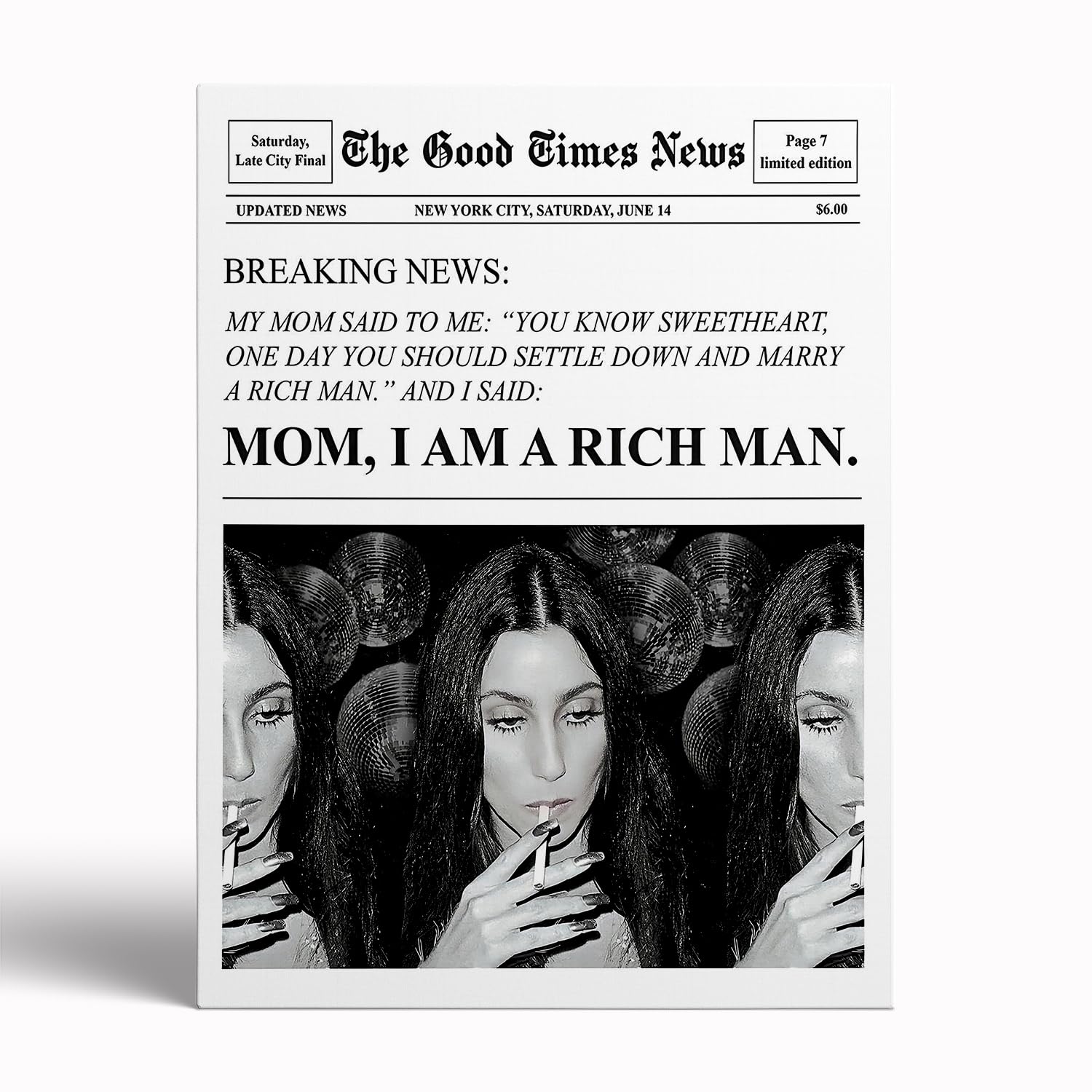 Trendy Black And White Design: This Stunning Trendy Black And White Women Newspapers Print Effortlessly Adds A Touch Of Modern Sophistication To Your Space, Making It An Essential Piece For Any Art Lover. Inspirational Cher Quote: Featuring The Iconic Phrase "Mom I Am A Rich Man," This Cher Quote Poster Serves As A Daily Reminder Of Empowerment And Confidence, Perfect For Those Who Appreciate Motivational Wall Art. Retro Bar Cart Style: Ideal For Enhancing The Aesthetic Of Your Living Area, This Retro Bar Cart Design Complements Your Decor While Showcasing Your Unique Taste In Art And Style. Feminist Expression: Embrace The Spirit Of Feminism With Our Newspaper Feminist Wall Art That Celebrates Strong Women And Their Stories, Adding Depth And Character To Your Bedroom Or Apartment. Aesthetic Magazine Cover Look: The Magazine Cover Aesthetic Of This Print Makes It A Standout Choice For Bedroom Apartment Dorm Decor, Ensuring Your Space Reflects Your Personality And Artistic Flair. Elevate Your Living Space With Our Stunning Trendy Black And White Women Newspapers Print, Featuring The Iconic And Empowering Quote From Cher, "Mom I Am A Rich Man." This Striking Poster Combines Retro Charm With Modern Aesthetics, Making It A Perfect Addition To Any Room. Designed To Capture The Essence Of Newspaper Feminist Wall Art, This Piece Exudes Confidence And Style While Celebrating Strong Female Figures. Its Magazine Cover Aesthetic Adds A Touch Of Sophistication, Making It An Ideal Focal Point For Your Retro Bar Cart Or As Standout Decor In Your Bedroom, Apartment, Or Dorm.