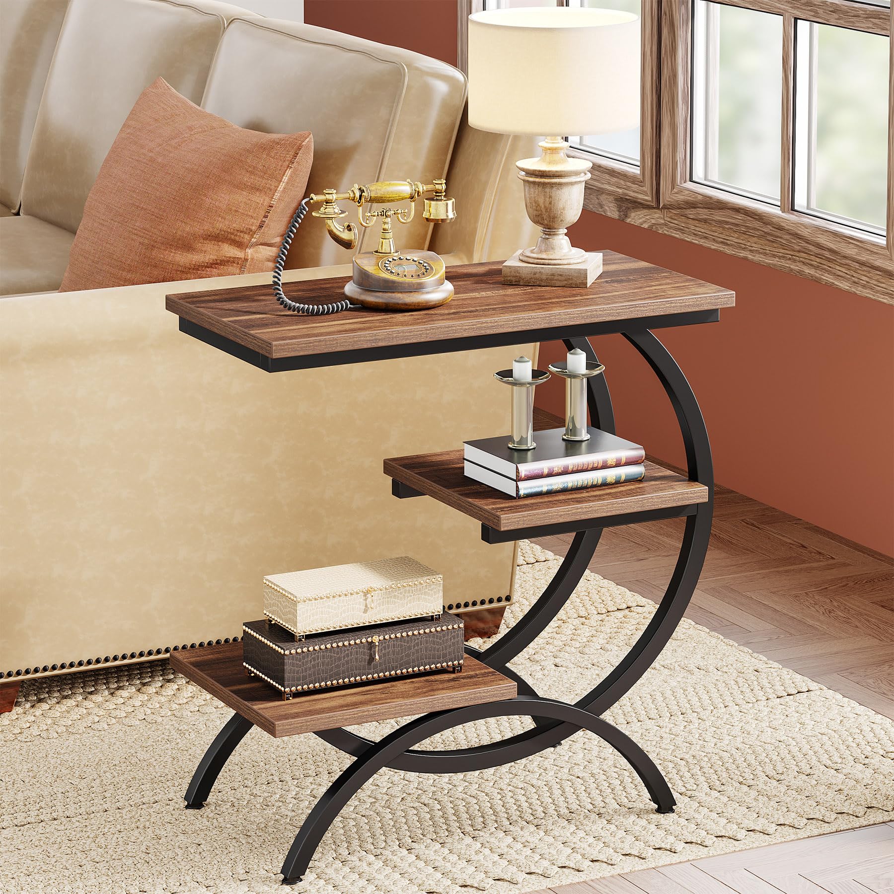 C Table Design: With its unique C-shaped profile, this c shaped end table seamlessly fits into corners next to sofas or beds, unlocking the potential of small spaces. Its simplistic yet functional appeal turns limited areas into a multipurpose haven Stable & Protective: Boasting thick particleboard panels and a robust metal frame composed of 4 C-shaped tubes, this living room side table is designed to withstand long-term use. Equipped with 4 adjustable feet to prevent scratching your floor Multifunctional Application: With its industrial appearance, this C-shaped end table adds a touch of style to any space, making it function as a sofa table, bedside table, or snack tray, injecting sophistication into your living area 3-Tier Shelf: This side sofa table features a 3-level design, offering ample storage space for all your necessities. It's ideal for organizing reading materials, displaying decor, or keeping your remote controls handy Easy to Assemble: The narrow side table for small spaces comes with clear instructions, and each installation accessory is numbered for easy assembly. One person can complete the installation in 30 minutes The uniquely styled C-shaped end table is designed to streamline the use of small spaces next to beds or sofas, turning them into multipurpose hubs with its minimalist yet functional design. Its durability is ensured by the thick particleboard panels and a robust metal frame composed of 4 C-shaped tubes. The addition of 4 adjustable feet prevents floor scratching, further enhancing its application. This industrial style end table not only serves as a sofa table or bedside table but can also be used as a snack tray, epitomizing versatility with a stylish touch. The couch table behind sofa is equipped with a 3-tier shelf design, offering generous storage space for essentials. The assembly process is made effortless with clear instructions and numbered installation accessories, allowing anyone to set it up within just 30 minutes