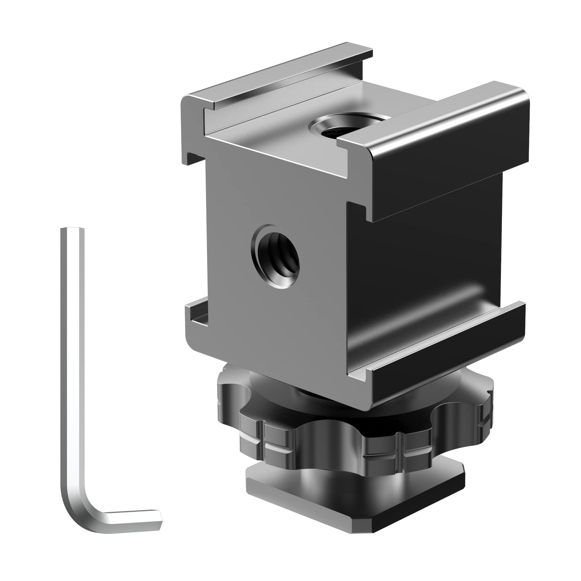 Triple Cold Shoe Mount Adapter Powerhouse:Unlock triple accessory slots instantly, This revolutionary cold shoe mount adapter transforms any single hot shoe mount into a multi-rig beast. Mount lights, mics, monitors simultaneously. Perfect for creators demanding pro-level flexibility from their cold shoe mount system. Feather-Light Yet Unbreakable:Aircraft-grade aluminum makes this cold shoe adapter 50% lighter (only 1.7oz) than steel competitors. Never sacrifice gear safety for portability,this hot shoe mount survives drops, dunks, and daily grind while sliding into any bag. Zero-Slip Swivel Lock: Tighten once, hold forever. Our knurled cold shoe mount adapter features vibration-damping rubber inserts that: ① Prevent scratches on delicate gear .② Eliminate accidental rotation .③ Lock accessories tighter than standard hot shoe mount systems Universal Studio-Grade Threading:1/4"-20 & 3/8"-16 threads on every cold shoe mount slot connect to: Boom arms Ring lights Phone clamps,Making this cold shoe adapter the ultimate expansion hub for DSLR, mirrorless, or camcorder rigs. Anti-Vibe Grip:Triple-locking teeth + knurled screws on this hot shoe mount deliver: 200% stronger grip vs. smooth screws.Zero wiggle in portrait/landscape mode.Vibration isolation for crisp. The NUOBAKE Triple Shoe Mount transforms your camera's single Hot Shoe Mount into three! Mount multiple lights,monitors or microphones in variations as endless as your creative potential.