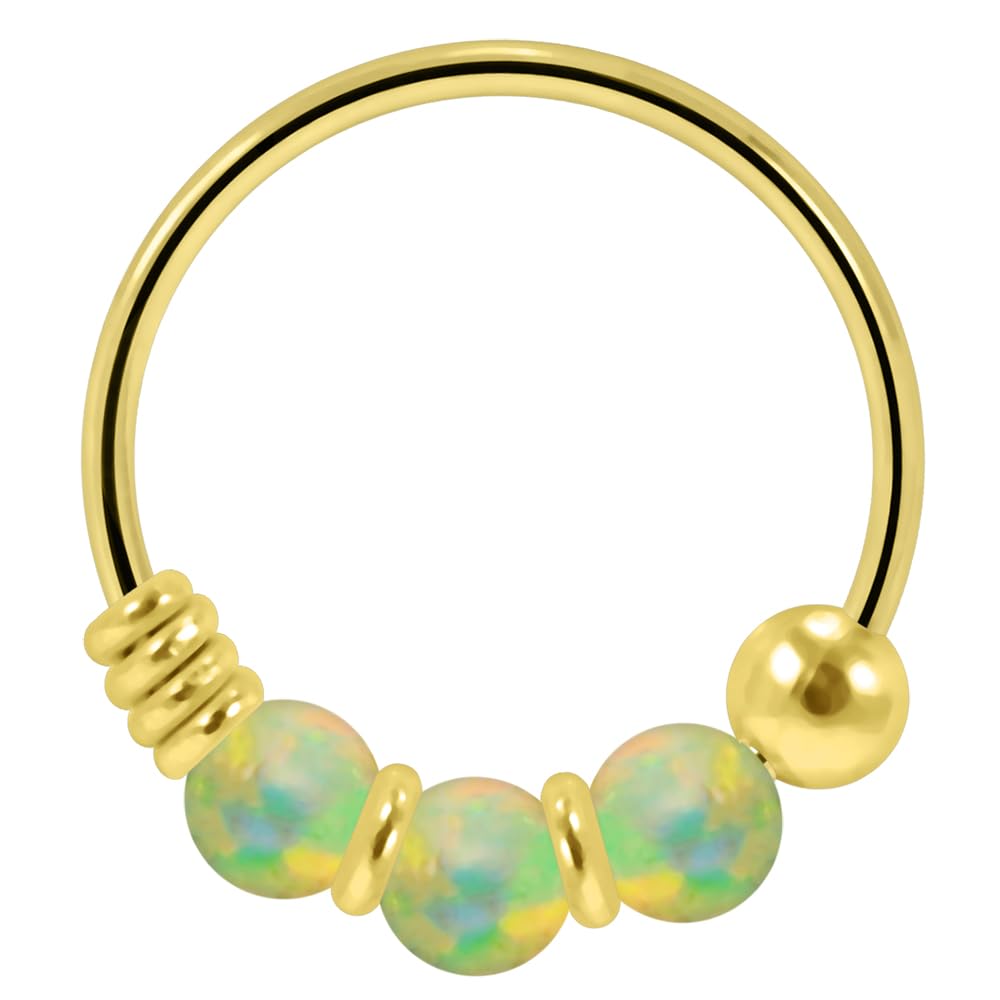 Triple Light Green Opal Stone 9K Solid Yellow Gold 22 Gauge Hoop Nose Ring Piercing Ring Body Jewelry. Made from 9K Solid Yellow Gold with Opal Gemstone , this nose ring is the perfect piercing to wear everyday, a comfortable fit that will help give you that extra sparkle daily Elegant Craftsmanship - All of our Segment Ring Piercings have been made from high quality hypoallergenic materials. This Segment Ring has been designed so that it is easy to put in and take out, they will fit comfortably inside your nose and ear. The Perfect Gift! - Whether you are looking to treat yourself or others, our piercings are the perfect gift to spread joy amongst others. Carefully packaged with care, give the gift of sparkles and piercings this year! Let Your Fashion Speak Out Loud - With the right piercing choice, PiercingPoint brings stylish and elegant piercing Jewelry for all. Your style is your statement to live freely, and we support you all the way. Our Customer Service Promise - We pride ourself on the quality of all our products and customer service. If you have any issues regarding your purchase or products, we are available around the clock to answer any questions you may have. Product Description - Materials : 14K Solid Yellow Gold with Opal Stone