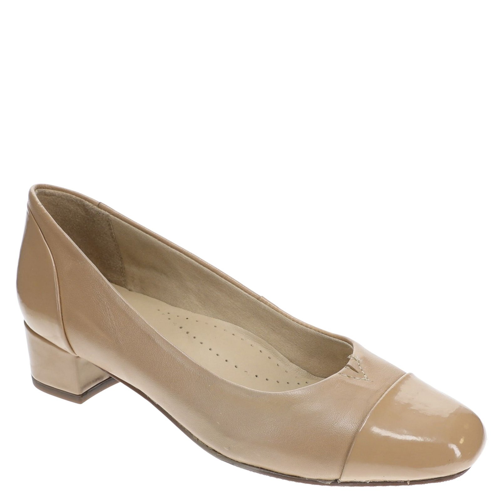 *Leather and synthetic patent upper *Closed shiny cap toe tip *Slip-on style with topline center core for easy on/off *Cushioned footbed *Dress outsole *1-1/4" heel height