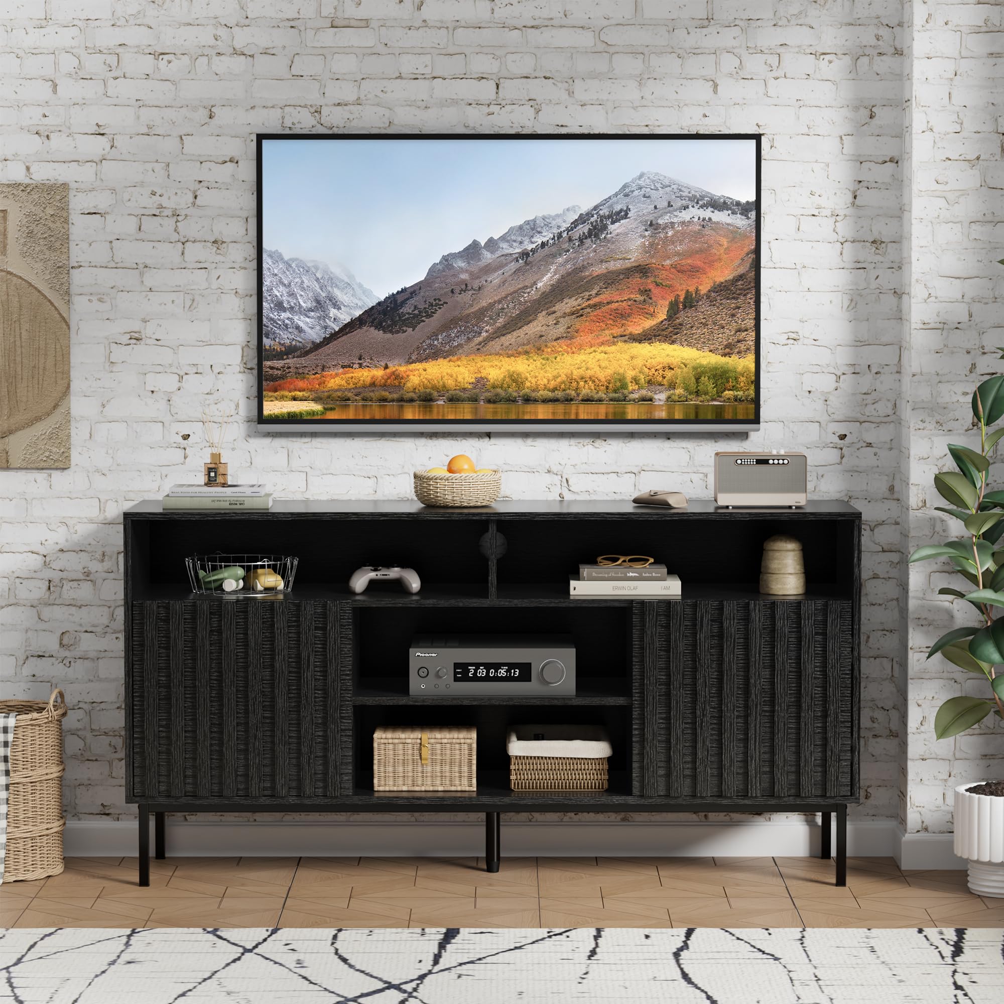 【Modern TV Console】Overall Dimention:W57.9*D15.2*29.7H,Top Open Shelf:W27.95*D13.9*6.3H,Mid Open Shelf:W22.0*D13.9*6.96H,Bottom Storage:W17.2*D13.9*15.2H,Feet:6.9H,Loading Capacity:Toally 240lbs.The accent TV storage cabinet for 40/50/55/60/65 inch TV in living room and bedroom. 【Fluted TV Cabinet】Geometric fluted panel design for TV stand cabinet with free handles and stable mental legs,weight capacity makes heavy duty easily. 【Wood TV Stand】Black color TV stand has 4 open shelves and 2 storage cabinets with fluted doors which provide you multi-storing choice.Wood TV console for living room and bedroom make it decor practical and beautiful. 【MCM Media Console】We designed the mid century modern TV Console sleek and minimalism,and keeps the storage and shelves storing and provides the amount space on the top. 【Accent TV Entertainment Center】Come with detail numbered accessories and easily following to assembly,and please contact us freely if you had any problems with the item. Mid Century Modern TV Stand 65 Inch for Bedroom