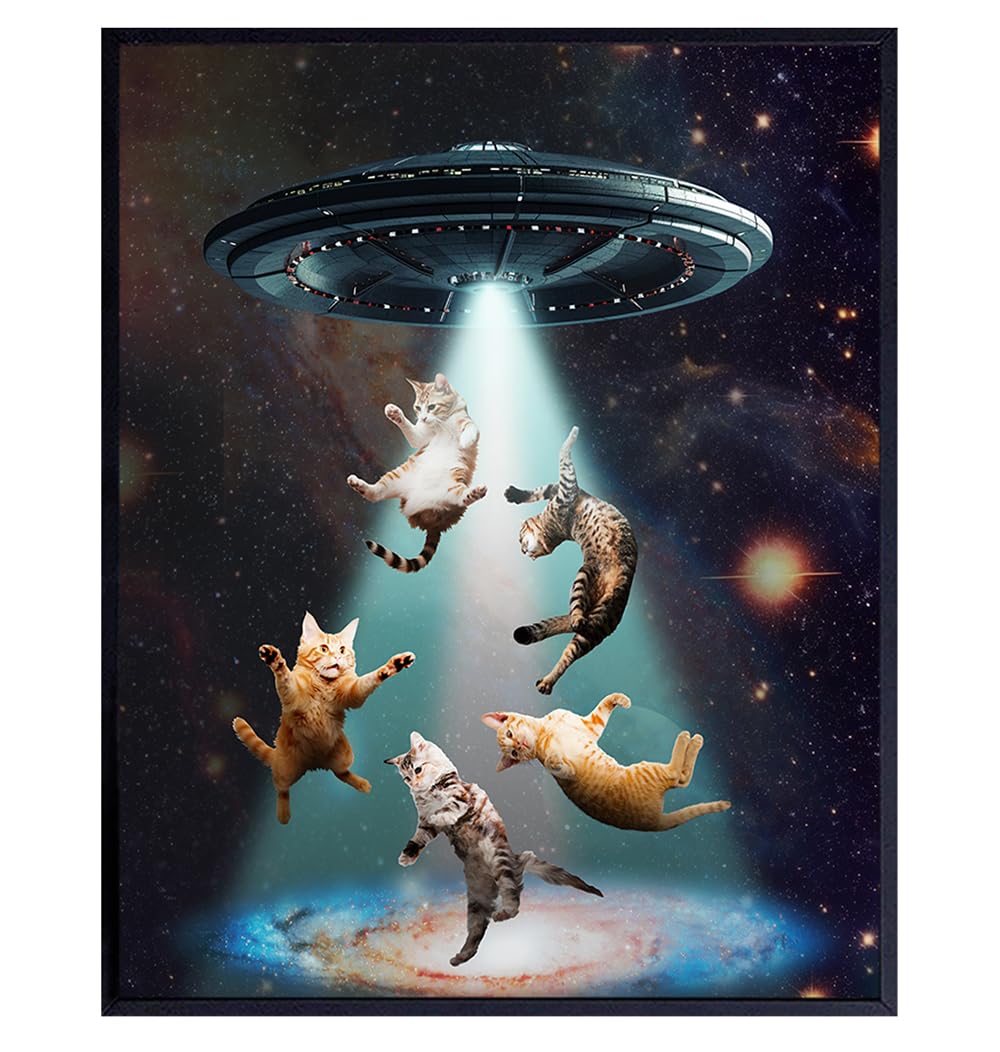 UFO funny Cat Wall Art & Decor - Cat Gifts for Men - Kitty Wall Decor - Animal Themed Kitty Dad Pet Stuff - Cute Kitten Decorations - Animal Lover