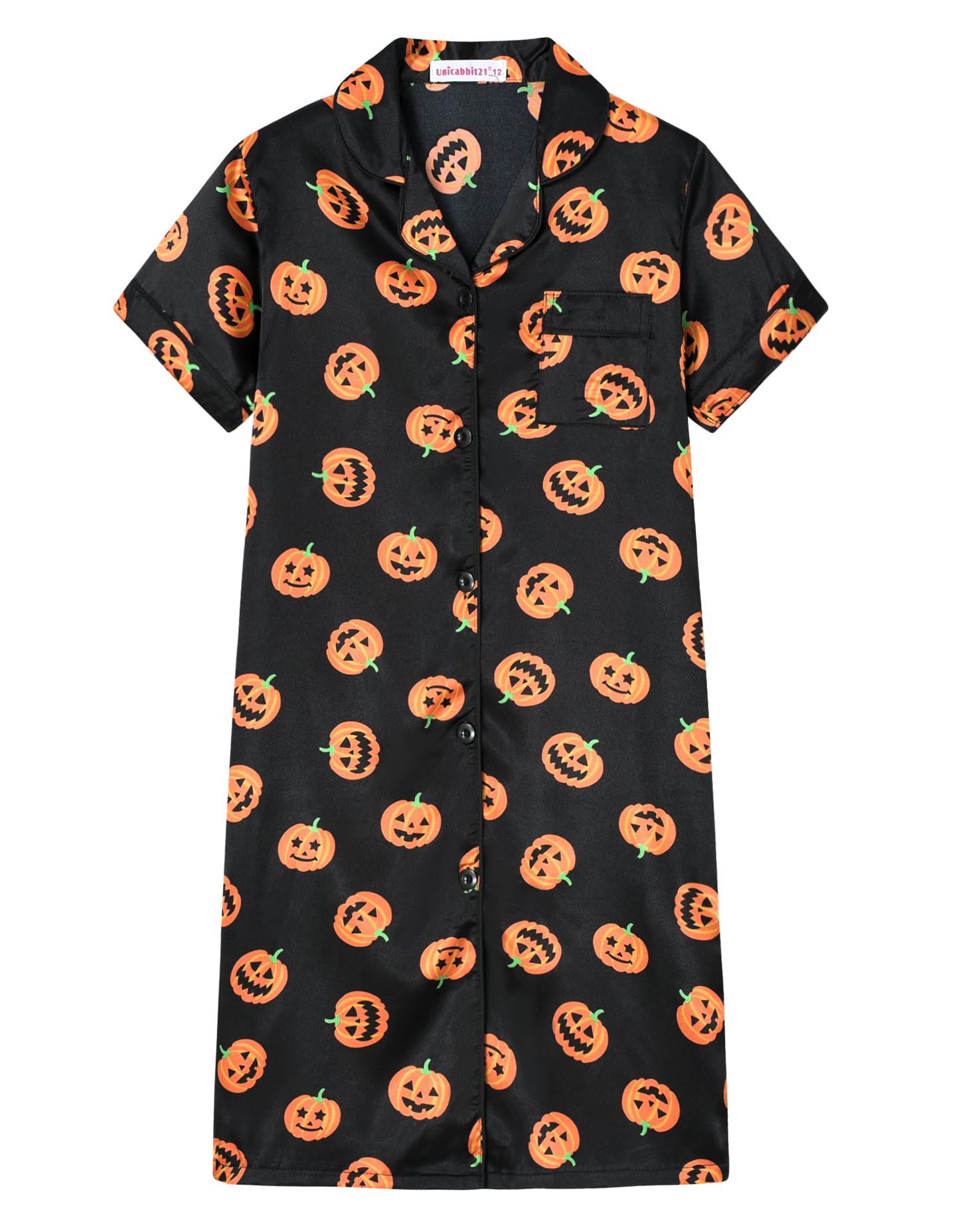These girls black pumpkin Halloween satin nightgowns set is made from 97% Polyester and 3% Spandex that's soft smooth silky material to the touch and a super cute solid color design that will make all day exciting! Available in sizes 8-16 for girls, fits true to size and keeps its cuteness wash after wash.You could choose it as a gift for Birthday,Thanks Giving Day,Halloween Day and Christmas Day. Perfect pair to keep your little and big kids on stylish from playtime to nap-time and comfortable for lazy lounge days, summer slumber parties,family photo-shoots,sleepovers or for a peaceful night’s sleep and year-round cuddles. The good quality casual style satin nightwear jammies set is very comfy and soft silky short-sleeved top with button down coat style pattern and a front chest pocket. These adorably soft and bright pajamas set will be your kids unisex girls boys new go-to pair for the sweetest dreams.You could choose the classic color you like for your kids.