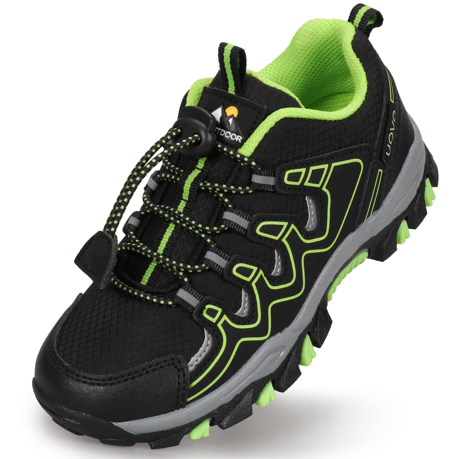 WATER REPELLENT VAMP - Kids waterproof shoes made with anti water splashing fabric ,allows kids to play at will, not to go out because of the rain. NON-SLIP RUBBER SOLE -Kids trainers/hiking shoes specially feature lightweight durable rubber sole have deep flex grooves for maximum grips in all directions . COMFORTABLE SKIN FRIENDLY LINING: Comfy High-standard breathable material, aim to provide healthy comfy wearing experience. The insole selects EVA foam, more breathable, cushioned and lighter comparing. FLEXIBLE CONVENIENT - Convenient bungee lacing closure for easy pull on, no need to tie shoes help kids put on shoes easier and quickly by themselves. ALL-MATCH FASHION STYLE - The slip on shoes for boys' classic Color block design, suitable for indoor outdoor sports, walking, running, playing, tennis, traveling, hiking and more. Best Christmas Halloween children's day birthday gift for your children. UOVO boys Hiking Shoes These are the best shoes for boys do some outdoor activities. Such as Hiking, Camping, Cycling, Running, Climbing, Walking and so on.Doing sports with UOVO kids shoes, the feeling will be so comfortable because they are Lightweight ,Breathable and Non-slip.What's more, with Convenient bungee lacing closure, it will be very easy on and off for kids.