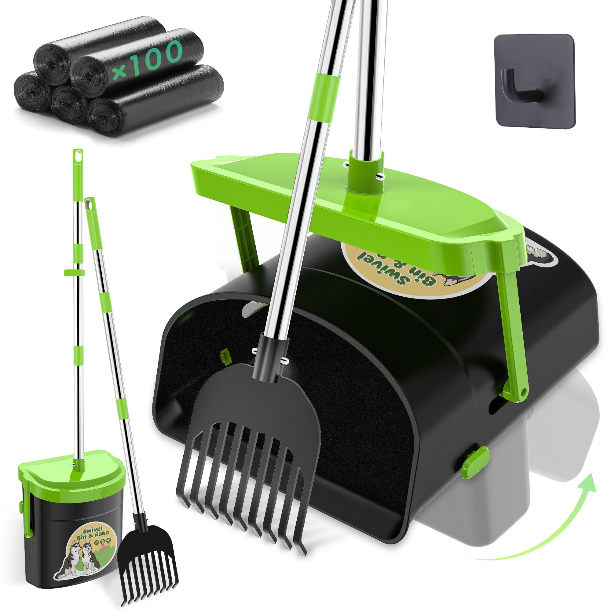 Outdoor Swivel Bin & Rake Kit: Large capacity bin with metal rake design simplifies pet waste cleanup. Swivel bin with odor-proof lid is easy to use for yards or multi-pet homes. Sturdy rake suitable for all surfaces, including dirt, gravel, and concrete No More Bending Over: The 33.4-inch ergonomic handle reduces stress on your back and knees. Long handle pooper scooper keeps you at a comfortable distance while cleaning up pet waste, durability of heavy-duty stainless steel is 10 times that of plastic Odor Blocking Lid Design: The lid design of this pet pooper shovel can effectively control odor, waterproof, this metal pooper scooper is a guardian of the fresh air in the yard. So that your yard becomes a happy world for pets, rather than a source of odor 100 Waste Bags & Upgraded Clip: Includes 100 easy-to-replace scooper bags, compatible with most bins. Features fixed bag clips on both sides of the large swivel bin. To prevent slipping, wrap the bag around the clip multiple times during use Packing List: Pet scooper comes with 100 bags, swivel bin*1, metal rake*1, metal poles*6, hook*1. Large pooper scooper can be easily assembled without easy tools during assembly