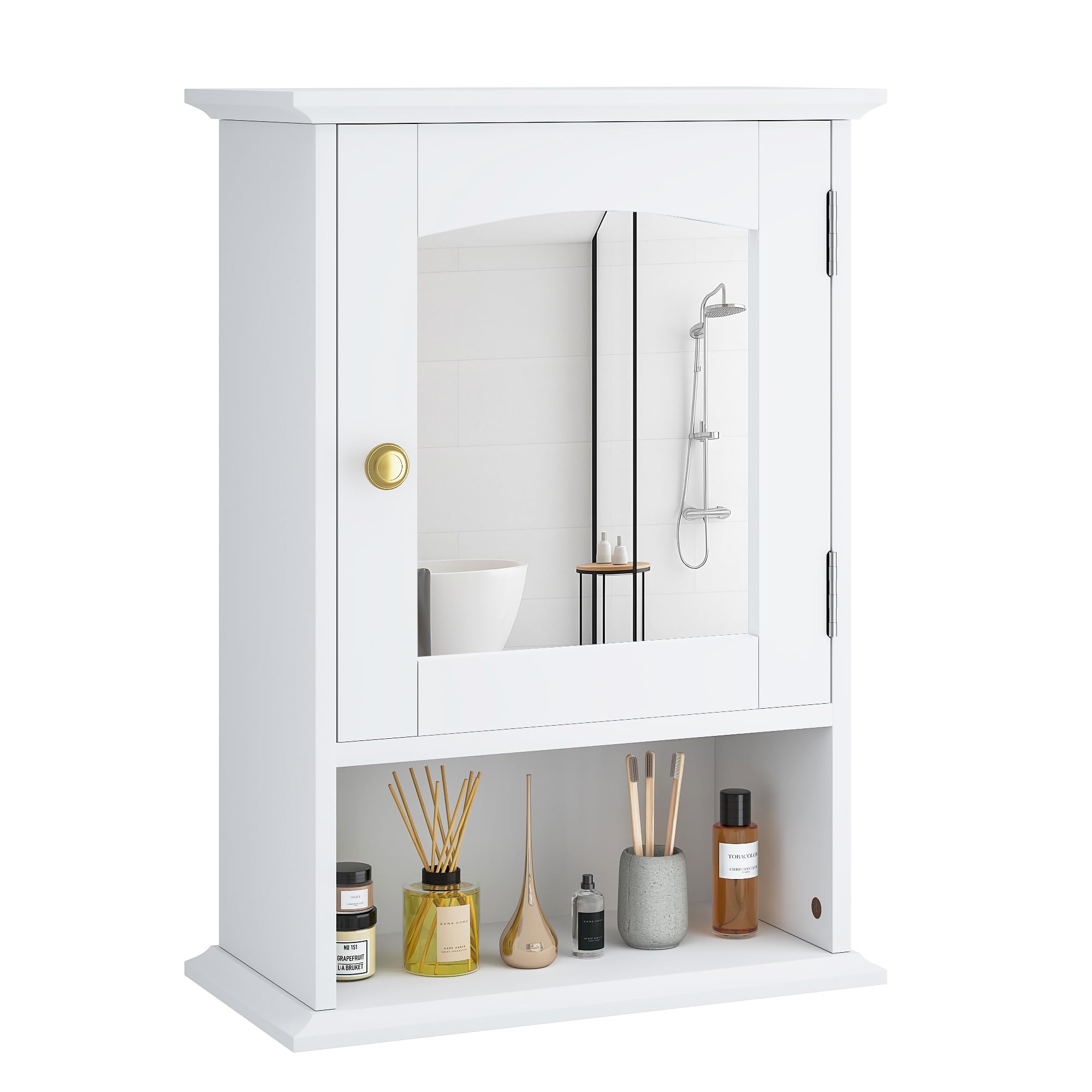 Wood Space-saving Design: This small bathroom wall cabinet makes full use of the wall space and combines storage function with mirror design, aesthetically pleasing and practical. Height-Adjustable Shelf: Shelf behind cabinet door can be adjusted to 3 height positions. Wall mount bathroom cabinet provides ample space for items of different size. Simple and Exquisite: Bathroom cabinet features enclosed shelf with door and one open shelf. Open shelf allow you to easily access your frequently used toiletries. High-quality Material: Medicine cabinet made of high-quality MDF board, which is durable. The surface of the wall cabinet is using a painted process that is waterproof, suitable for bathroom. Effortless Assembly: The package comes with clear assembly instructions and all necessary tools, with components clearly labeled for quick assembly in just 15 minutes.