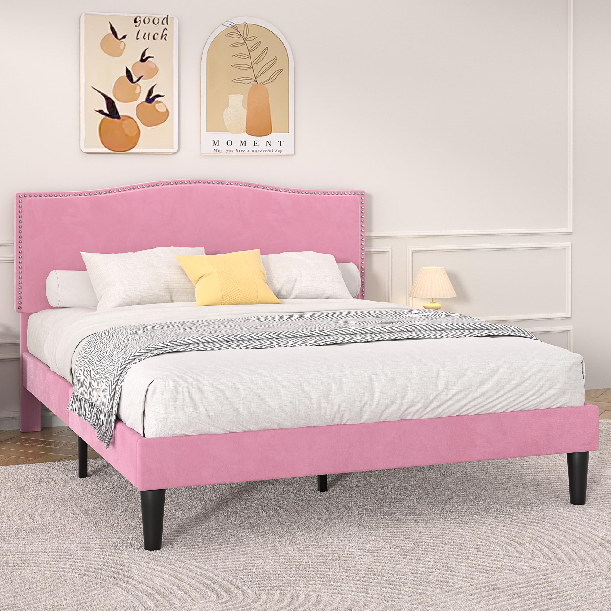 【Premium Velvet Upholstery & Sturdy Support】 This upholstered platform bed frame features a luxuriously soft velvet surface that is skin-friendly, breathable, and easy to clean. The padded headboard is filled with eco-friendly, high-density rebound foam for superior comfort when reading or relaxing in bed. Built with a strong wooden frame, 12 durable wooden slats, and 8 heavy-duty support legs, this full size bed with headboard can hold up to 600 lbs without sagging—no box spring needed. 【Noise-Free, Stable & Durable Structure】 Our modern platform bed uses Velcro-secured slats to eliminate squeaks and prevent mattress movement, ensuring a quiet night’s sleep. The full velvet wrap not only looks refined but also cushions accidental bumps for added safety. The sturdy headboard with decorative nailhead trim enhances the bed’s stability, giving you a noise free bed frame that’s built to last and won’t wobble over time. 【Adjustable Height Headboard for Customized Comfort】 The adjustable headboard can be set between 41.7" and 47.7" in height, allowing you to match your preferred sleeping position and mattress thickness. Works perfectly with mattresses from 6" to 12" thick (mattress not included). Whether you prefer a low-profile look or extra back support, this bed adapts to your needs with ease. 【Modern & Elegant Bedroom Style】 Designed with graceful floral-inspired lines and classic nailhead accents, this velvet platform bed frame blends timeless style with contemporary simplicity. Its low-profile yet luxurious appearance complements various bedroom décors—from modern minimalism to classic sophistication—making it the perfect centerpiece for your master or guest bedroom. 【Easy Assembly & Reliable Customer Service】 All tools, parts, and step-by-step instructions are neatly packaged for quick, hassle-free assembly—most customers can set it up in under an hour. This platform bed frame with headboard is designed for convenience and built to last. If you have any questions or issues, our responsive customer service team will reply within 24 hours to ensure your satisfaction.