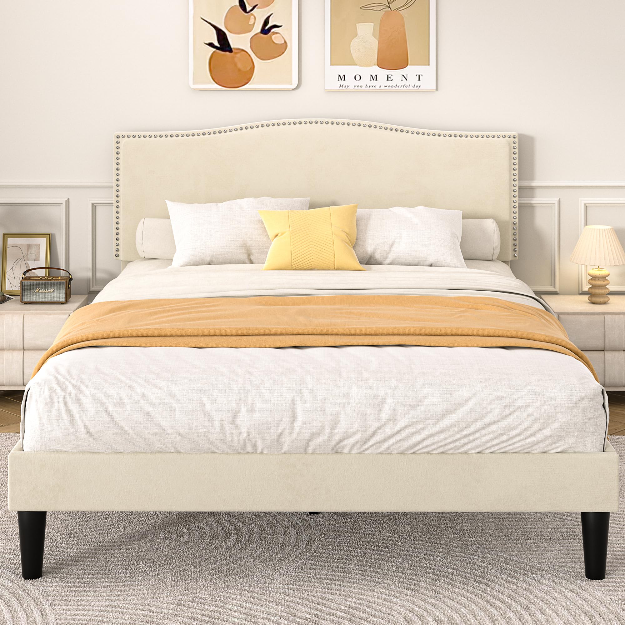 【Premium Velvet Upholstery & Sturdy Support】 This upholstered platform bed frame features a luxuriously soft velvet surface that is skin-friendly, breathable, and easy to clean. The padded headboard is filled with eco-friendly, high-density rebound foam for superior comfort when reading or relaxing in bed. Built with a strong wooden frame, 12 durable wooden slats, and 8 heavy-duty support legs, this queen size bed with headboard can hold up to 800 lbs without sagging—no box spring needed. 【Noise-Free, Stable & Durable Structure】 Our modern platform bed uses Velcro-secured slats to eliminate squeaks and prevent mattress movement, ensuring a quiet night’s sleep. The full velvet wrap not only looks refined but also cushions accidental bumps for added safety. The sturdy headboard with decorative nailhead trim enhances the bed’s stability, giving you a noise free bed frame that’s built to last and won’t wobble over time. 【Adjustable Height Headboard for Customized Comfort】 The adjustable headboard can be set between 41.7" and 47.7" in height, allowing you to match your preferred sleeping position and mattress thickness. Works perfectly with mattresses from 6" to 12" thick (mattress not included). Whether you prefer a low-profile look or extra back support, this bed adapts to your needs with ease. 【Modern & Elegant Bedroom Style】 Designed with graceful floral-inspired lines and classic nailhead accents, this velvet platform bed frame blends timeless style with contemporary simplicity. Its low-profile yet luxurious appearance complements various bedroom décors—from modern minimalism to classic sophistication—making it the perfect centerpiece for your master or guest bedroom. 【Easy Assembly & Reliable Customer Service】 All tools, parts, and step-by-step instructions are neatly packaged for quick, hassle-free assembly—most customers can set it up in under an hour. This platform bed frame with headboard is designed for convenience and built to last. If you have any questions or issues, our responsive customer service team will reply within 24 hours to ensure your satisfaction.