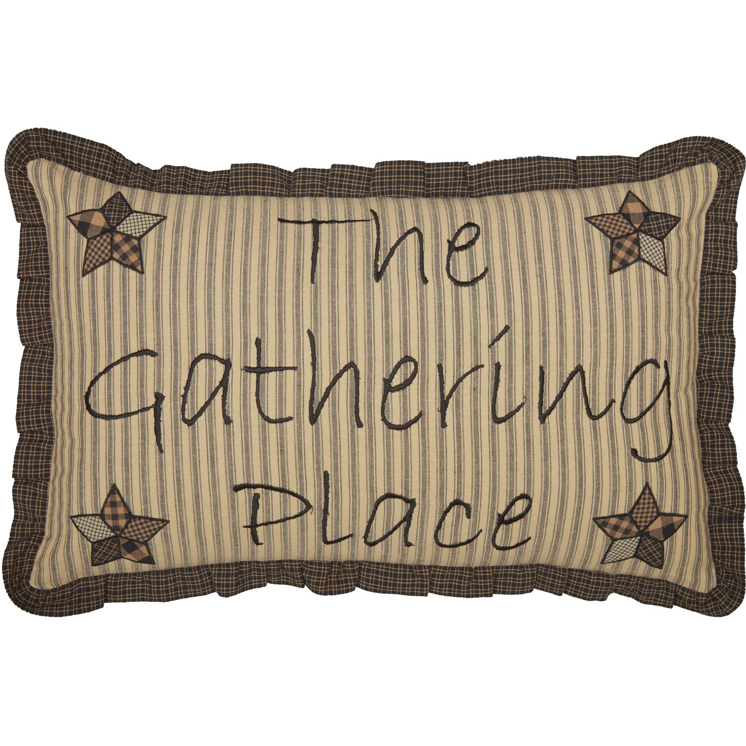 100% Cotton PREMIUM CONSTRUCTION: Our 100% cotton traditional text-patterned pillow is expertly crafted using a unique yet durable flat weave paired with ruffled edges and tie closures to ensure high-quality for years to come. The pillow expands when unpackaged to create a fuller appearance. PRIMITIVE DESIGN: Traditional handcrafted style that compliments any primitive or country home. Our pillow features raven black, creme, and charcoal grey with the words “The Gathering Place” overtop an applique and embroidered design. Reverses to a striped pattern for an additional country decor option. COORDINATING ACCESSORIES: Pair this primitive pillow with matching bed skirts, shams, quilts, panels, and valances from the Farmhouse Star collection. EASY CARE: To give your cotton pillow as many years of quality comfort as possible, place it in the wash on a gentle cycle, and afterward tumble dry low. SIZE: Raven black, creme, and charocal grey hues give this pillow a modern primitive feel while keeping to a country design. The generous size of 14x22 inches is perfectly tailored to fit in any area of your home. A great addition to your primitive or country decor, this 14x22 Farmhouse Star Gathering Place Pillow brings warmth and welcome to any room. The words "The Gathering Place" give a festive cheer that is great all year long. Add this black, creme, and charcoal grey pillow with it's applique and embroidery to any place in your home. 100% cotton shell.