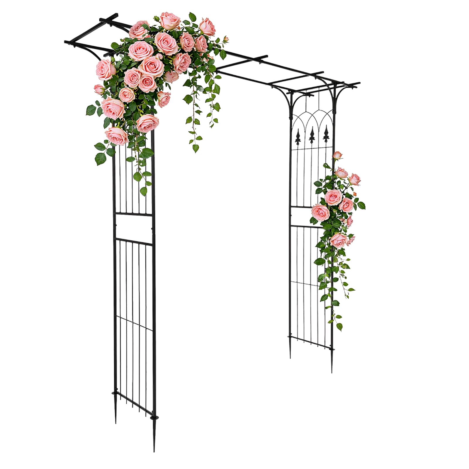 Elegant Arch: Whether standing alone or covered with climbing vines and flowers, these outdoor metal arch add a striking focal point to your yard. Adding grace and prominence to any outdoor venue with the Arbor features squared lattice side panels Multi-purpose: It can be used for anniversaries or outdoor weddings. Flowers and plants can be allowed to climb. Place the arbor as an entrance or gate to instantly give it a more sophisticated and a lush look CLIMBING PLANTS Trellis - These garden arches are designed to accommodate and support all types of climbing plants and vegetables Easy to assemble: Simple assemble the product save your energy and time, weather resistant and easy to maintain. Durable: Rustproof iron frame with powder coated finish lasts for years. Simply stake into the ground for fast and easy installation, The Long Nails add stable in the soil Outdoor Decoration: Light the garden arbor to give it new flair. Christmas lights or party lanterns add an air of elegance to the arbor and can be strung up the posts and atop the structure,aiming for a festive environment