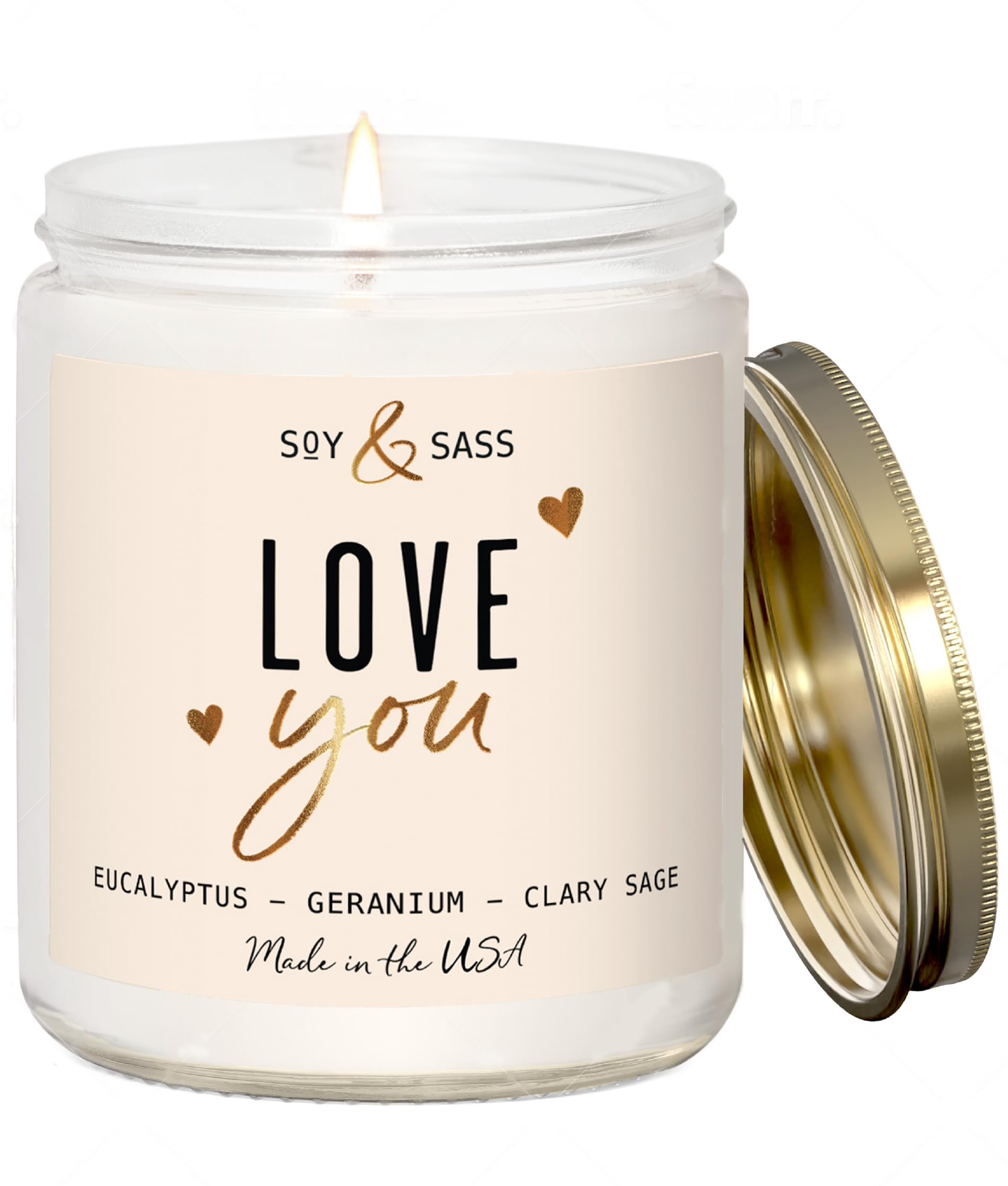 ROMANTIC VALENTINES DAY GIFT FOR HER – Watch her smile grow as she reads the loving message ‘Love you’ etched in cursive gold foil script for a touch of elegance, THE SCENT OF ROMANCE – Set the mood this Valentine’s Day by infusing your room with the Spa aroma of EUCALYPTUS & GERANIUM, creating a cozy and sensual ambiance for the holiday of love! VALENTINE CANDLE WITH SOY WAX FOR AN ECO-FRIENDLY CLEAN BURN - each 9oz candle is hand poured in the USA using an all-natural blend of 100% Soy Wax ingredients, lead-free cotton wicks & premium fragrance oils, poured into a re-usable jar - so they're good for your nose and body! CONSIDER GETTING 2 - Have multiple people to buy for?...Check out our Soy and Sass store for all your gifting needs! We have a Zodiac Range, Boss Lady, Happy Birthday & more! HAND-POURED WITH CARE IN THE USA & TRADEMARKED DESIGN - We take pride in our candles & it shows…All Soy and Sass's candles are designed by our team and trademark filed with the USPTO. We'd love you to support our small business where all our Candles are poured in small batches! Valentines Day Gifts for Her, Valentine Candles -"I Love You" Candle, w/Eucalyptus & Geranium I I Love You Gifts for Her I Valentines Day Candle for Wife, Girlfriend I 9oz, 50Hr Burn, USA Made
