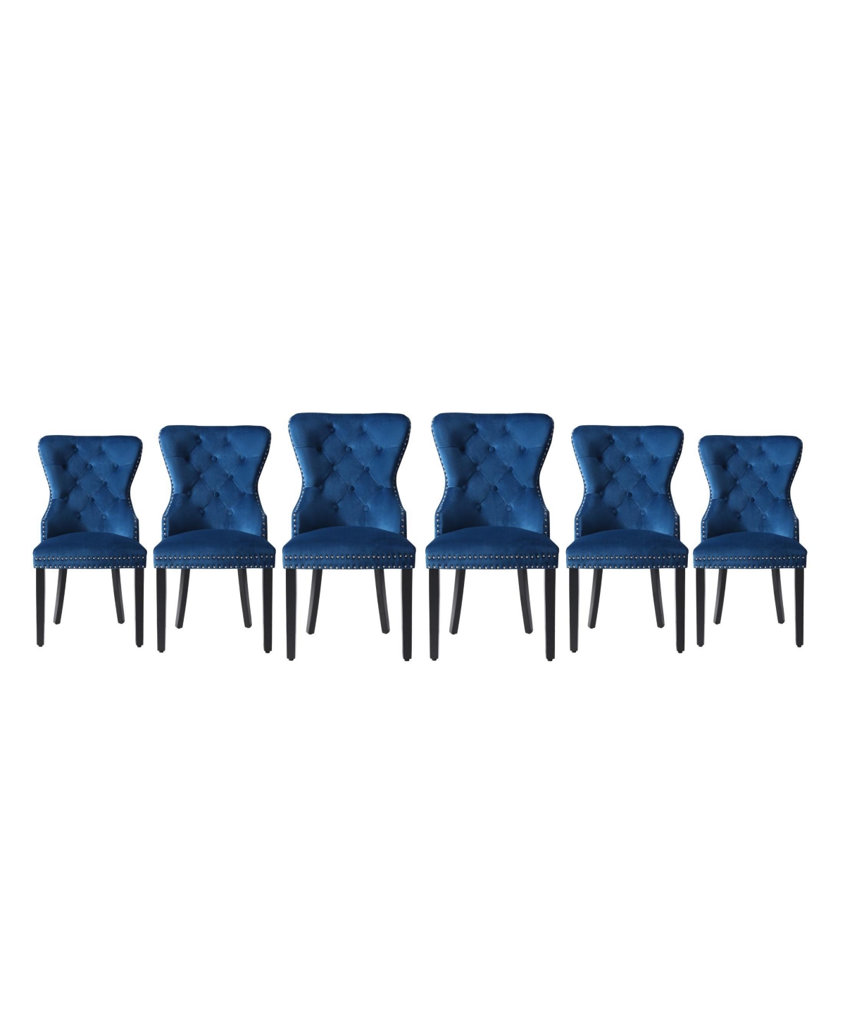 Add some style and glam up your dining room with this lovely six-piece velvet dining chairs. The diamond button-tufted design, silver nailhead trim, silver pull ring on the back for easy movement of the chair, and wingback design make the chairs a standout conversation piece. A velvety fabric that is soft to the touch and provides amazing comfort, especially thanks to the thick cushion that is perfect for gathering around the dinner table for hours. If the chairs are not perfectly leveled, a handy foot leveler are on the front legs to adjust for the perfect level.