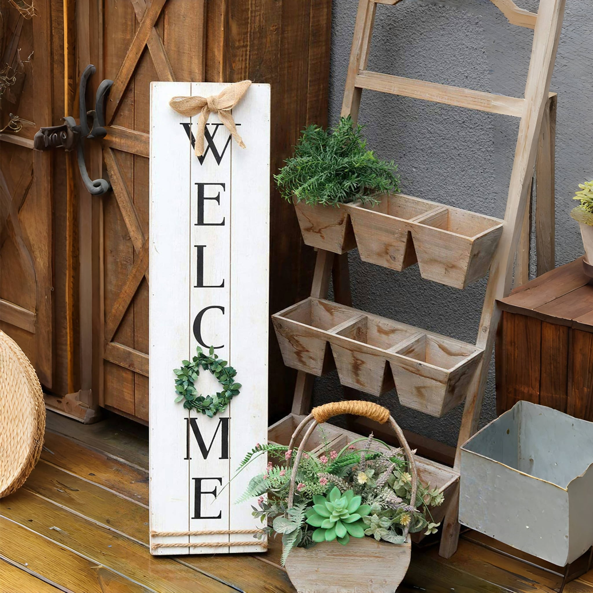 A perfect way to welcome your family, friends and neighbors to your beautiful home. Features: "Welcome" sign with a green PVC wreath to replace the "O", Decorated with jute bowknot and string. Brimming your home with cozy.
