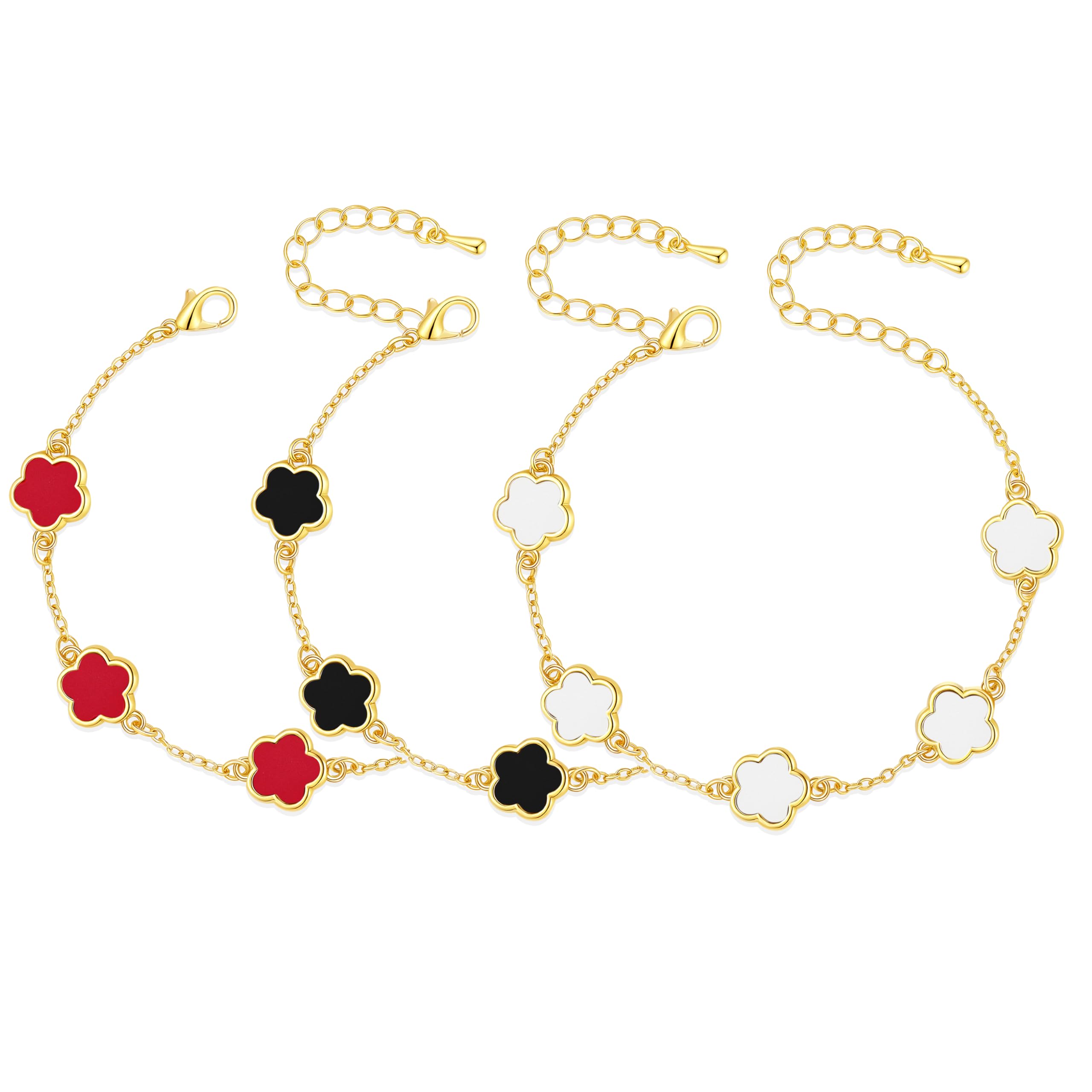 SYMBOL OF LUCK: This set of 3 clover bracelets for women features four-leaf clover charms in white, black, and red, symbolizing true love, health, fame, and wealth, bringing luck to every wearer with its meaningful design. VERSATILE THREE-PIECE SET: With three colors—white, black, and red—these four-leaf clover jewelry pieces allow for stylish layering or individual wear, perfect for adding a pop of color to any outfit. ADJUSTABLE FOR ALL WRISTS: Each 6.3-inch bracelet includes a 1.96-inch extension chain, ensuring a comfortable fit for most wrists, crafted with Gold Tone stainless steel for lasting shine. PERFECT FOR ANY OCCASION: Ideal for daily wear or gifting, these Gold Tone bracelets for women suit holidays like Christmas, Mother’s Day, or birthdays, offering a thoughtful and elegant touch to any celebration. YOUR SATISFACTION MATTERS: If you have any questions after receiving your item, feel free to contact our customer support team at any time. We are committed to ensuring you have the best shopping experience and will respond within one day. Discover luck with this Set of 3 Clover Bracelets for Women, featuring - stainless steel and four-leaf clover charms in white, black, and red. Adjustable from 6.3 to 8.26 inches, these bracelets are perfect for daily wear or gifting on Valentine’s Day, Mother’s Day, or Christmas. A meaningful accessory symbolizing love and fortune.