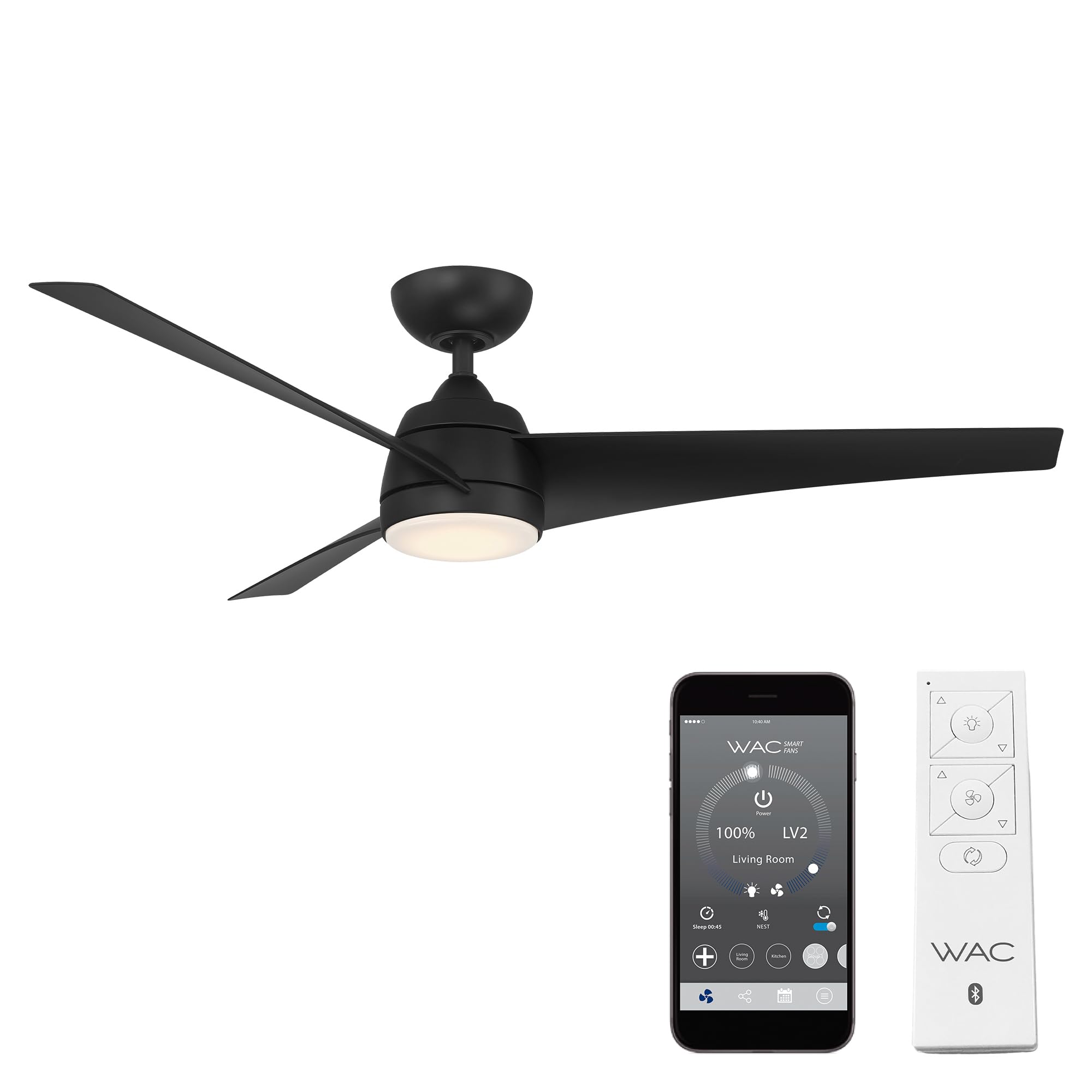SMART: WAC Smart Fans can be controlled from the WAC Smart Fan app, enabling smart features and full control of your fan from an iOS or Android device. Download the app to pair with the smart home tech you know and love, including Google Assistant, Amazon Alexa, Samsung Smart Things, and more! FEATURES: The WAC Smart Fan iOS or Android app can sync with your ceiling fan to control fan speed, use smart features like breeze mode, adaptive learning, create groups, and reduce energy costs. High quality blades ensure your fan blades don't droop or sag over time. TRADITIONAL CONTROLS: Battery operated Bluetooth remote control with wall cradle is included (Part # RC20-WT). An optional Bluetooth hardwired wall control is sold separately (Part# WC20-WT). Wall and remote control use Bluetooth for improved range and can control an unlimited amount of fans within range. TECHNOLOGY: WAC Smart Fans are made with incredibly efficient and completely silent DC motors and are up to 70% more efficient than traditional fans. Every fan is factory-balanced and sound tested to ensure each fan will never wobble, rattle or click. STANDARDS: UL & cUL Wet Location Listed for indoor or outdoor applications. Includes a 6in Downrod and can be mounted on slope ceilings. Additional downrod lengths sold separately (SKU # DR-FINISH). WAC warranties all ceiling fans for 5-years. LUMINAIRE SPECIFICATIONS: Includes a high lumen output (1600 lumens) plug-and-play replaceable LED luminaire powered by WAC Lighting with smooth and continuous brightness control.