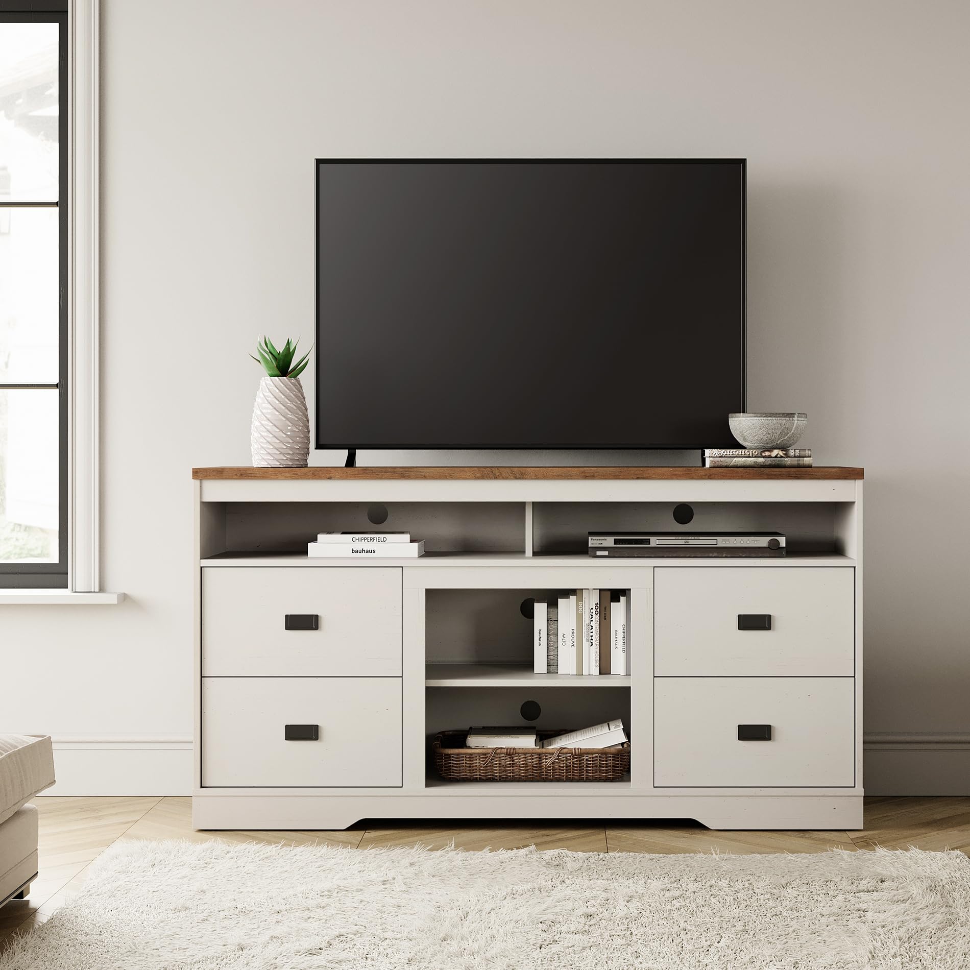 Farmhouse Style TV Table: Farmhouse tv stand features an exquisite retro metal decor, meanwhile its unique natural variations design in grain, color, and texture, add a touch of country style to your living area, Matching perfectly with other furniture in the WAMPAT living room furniture series Ample and Flexible Storage: This television stand comes with 4 drawers, with a 3-level adjustable and removable shelf to assembly the electric fireplace . Open storage compartments at the top for the CDs, DVDs, gaming box, decorations, etc..Each beside storage cabinet has adjustable end shelves which offer extra storage Sturdy & Quality Assurance:Wood TV stand is made of thick manufactured wood, durable, strong, and easy to clean. There is a professional connection between the TV cabinet and the side table to ensure stability and safety in use.The entertainment stand can support up to 220 pounds on the tabletop Cable Management and Anti-tip device :The cable management feature of this TV cabinet. The holes in the back panel make it easy to thread and hide wires, maintaining the neatness and aesthetics of your living space.The TV cabinet is equipped with an anti-tip device, which not only protects your cabinet and the valuable electronic devices placed on top from damage, but more importantly, it safeguards you and your family members from accidental injuries Easy to Assemble& 5-Star Service:This wood tv table has clear step-by-step illustrated instructions, easy to read and follow (2 adults are recommended). You can also follow the assembly video to complete it easier. Each screw, pin, and panel has its own code. If there are any issues with your package, please do not hesitate to contact us. Our professional customer service team will respond within 24 hours to provide you with a satisfactory solution Farmhouse TV stand, as a piece of furniture that combines traditional style with modern practicality, not only adds a touch of nostalgia to your living space but also meets the practical needs of modern life. The design of this TV cabinet draws inspiration from classic furniture styles while integrating functional elements of contemporary home decor, making it a beautiful focal point in the living room.