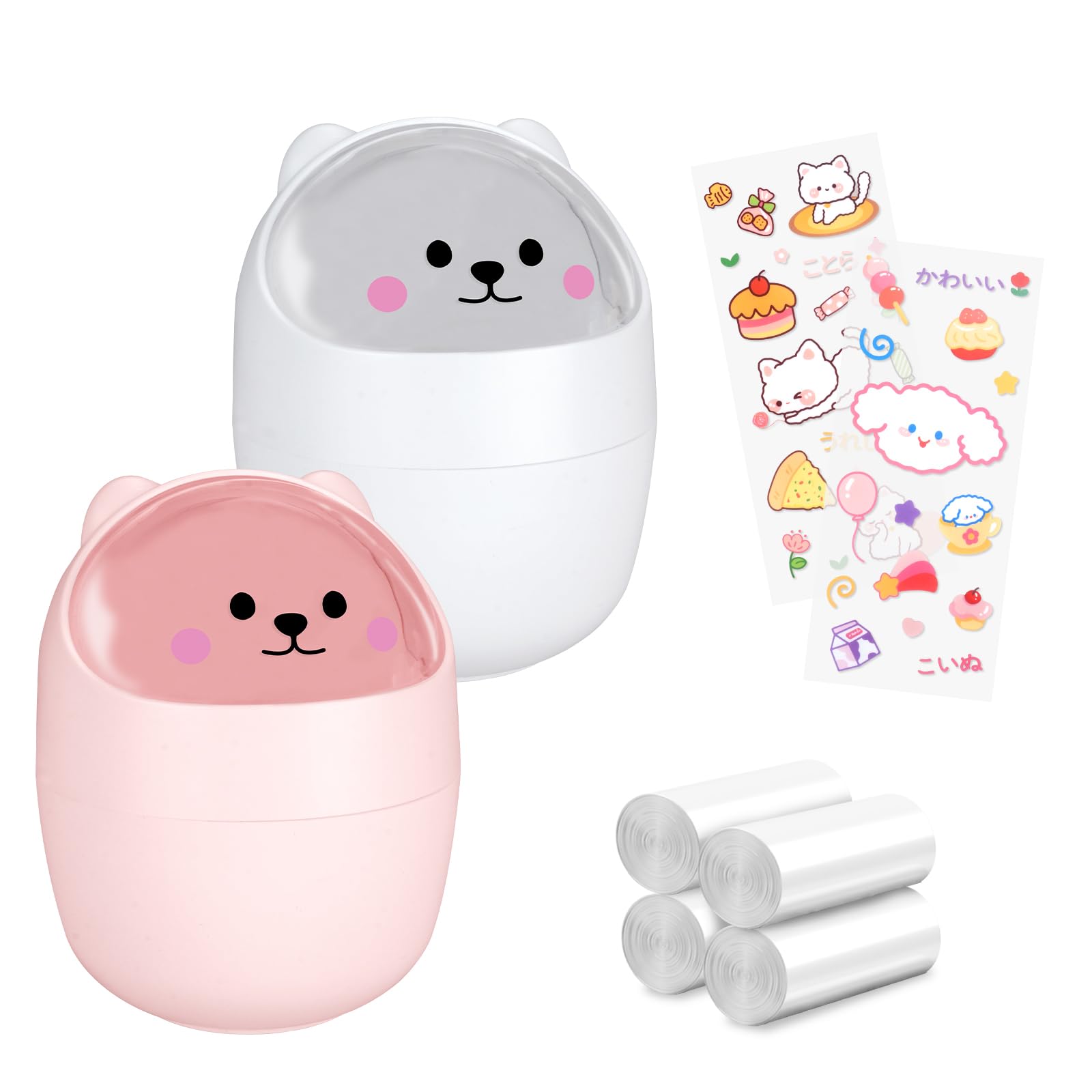 đžăKawaii Exterior DesignăThis desktop bin is beautifully designed and modelled on cute animals. Whether it's a chubby bear or a lively kitten, each shape comes to life and instantly adds life to your desktop. We've also included 2 cute stickers so you can DIY your own unique wastebasket. đžăMulti-functional UseăOur desktop waste bin is perfect for organising waste paper, cosmetics, small stationery, fruit peels and other small items. It's perfect for bathroom vanities, writing desks, kitchen countertops, car dashboards and other desktops. This bin can be placed anywhere you want, it is a unique decorative highlight for any room, and it is also a cute and practical gift for your friends and family. đžăLight and PragmaticăThis cute trash can with lid is very practical, it not only organizes things, but it is also a lovely decoration in our life. Not only does it simplify our lives, but it's more like a little elf that's always with us!Meanwhile, the flip-top or pull-out design ensures smooth opening and closing. It effectively blocks unpleasant odors while facilitating easy trash disposal, perfectly combining beauty and functionality. đžăProduct SizeăThis kawaii trash can is 4.2 inches long, 6.3 inches wide, 4.9 inches tall and weighs 5.39 ounces. We've paired it with a great value package that includes: 2pcs cute trash cans, 4 rolls of trash bags, and 2 pcs diy stickers so you can dress up your little munchkin however you like! đžăMaterialăThis kawaii shape garbage cans is made of plastic, sturdy and durable, not easy to deform or crack even after long-term use. The odourless material ensures safe and healthy use, and the easy-to-clean surface can be wiped clean with a damp cloth to keep the bin tidy at all times, bringing you a long-lasting high-quality experience. Bid farewell to desktop nuisances:â