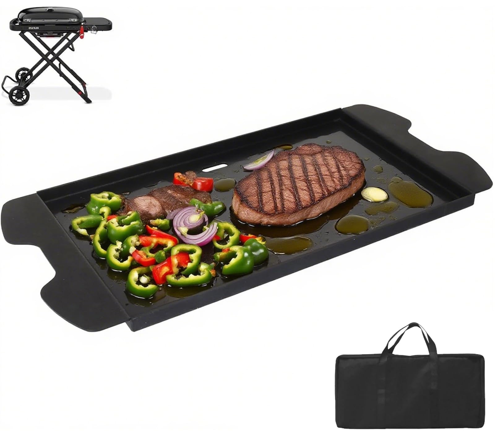 The griddle for weber traveler portable gas grill; for Weber traveler 9010001 9013001 9020001 9030001 9011701, Compatible with weber grill griddle plate 7034. Replacement parts for weber traveler portable gas grill, for weber 9030001 traveler portable gas grill, grill plate for weber traveler grill and more other grills,Please check the size you need before ordering! HIGH QUALITY MATERIAL: Made of durable heavy metal, warms up quickly, food tastes better, not easy to rust, corrosion resistant. We are equipped with a carry bag, made of high quality 600D oxford fabric, not easy to damage, easy to transport and storage EVEN HEATING: Thick material ensures even heat distribution, making it perfect for cooking chicken, pancakes, veggies, bacon, sausage, and any type of food you love! Guaranteed to provide healthy and delicious meals for your family, the non-stick coating ensures durability and provides cooking efficiency EASY TO CLEAN: Wash with mild soap and wipe with oil after each cooking session, you can maintain the non-stick surface of the griddle, using a non-stick coated surface that makes your food less likely to stick and ensures 100% health while making your cleaning a breeze. What you get: 1 pack of griddle pan and 1 pack of carry bag, griddleMade of high quality materials,the bag made of heavy duty 600D oxford fabric, Dimensions: 24.5"L X 11.5"W ,Please check the size you need before ordering!