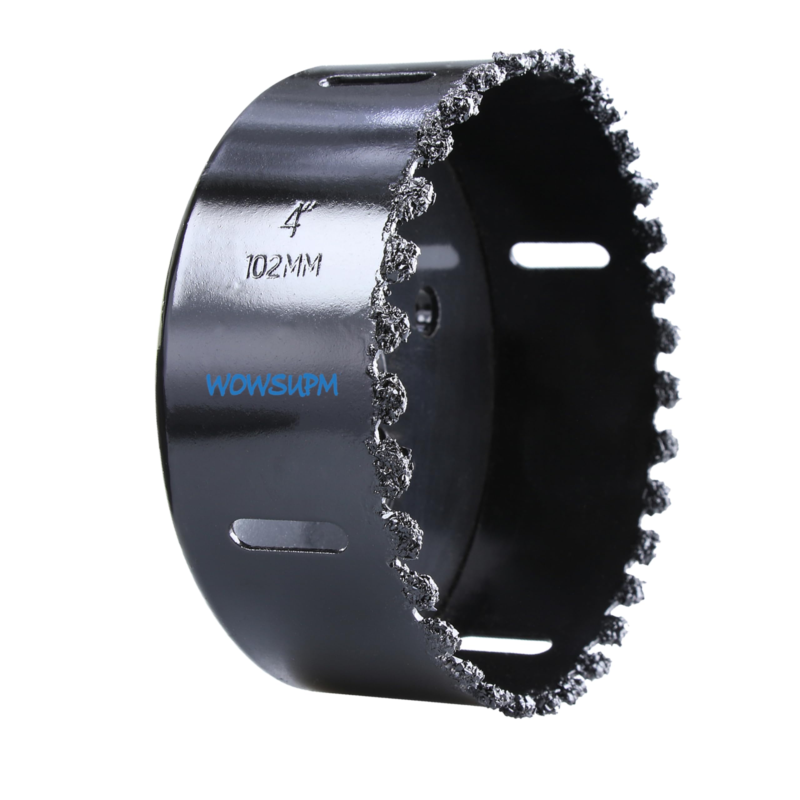 Package: 1 of 4” 102 mm carbide hole saw drill bit. Cut Abrasive Material: The carbide grit hole saw cuts through a wide range of abrasive materials. It compares with Bi-metal hole saw cutting the abrasive material, up to 3X longer life. Max Cutting depth: Up to 1-1/2” (38 mm) More Hard Teeth: The carbide grit teeth hardness over 80 HRC. It is more sharp, hard. Application: It’s fit for recessed lighting, dryer vent hole and other roof vent. It is for Air Brick, Fiber Cement Siding, Backer Board, Stucco, Plasterboard, MDF, Hardy Plank, cement board, sheetrock (no good for wood). This carbide grit hole saw bit is for Air Brick, Fiber Cement Siding, Backer Board, Stucco, Plasterboard, MDF, Hardy Plank, cement board, sheetrock.
