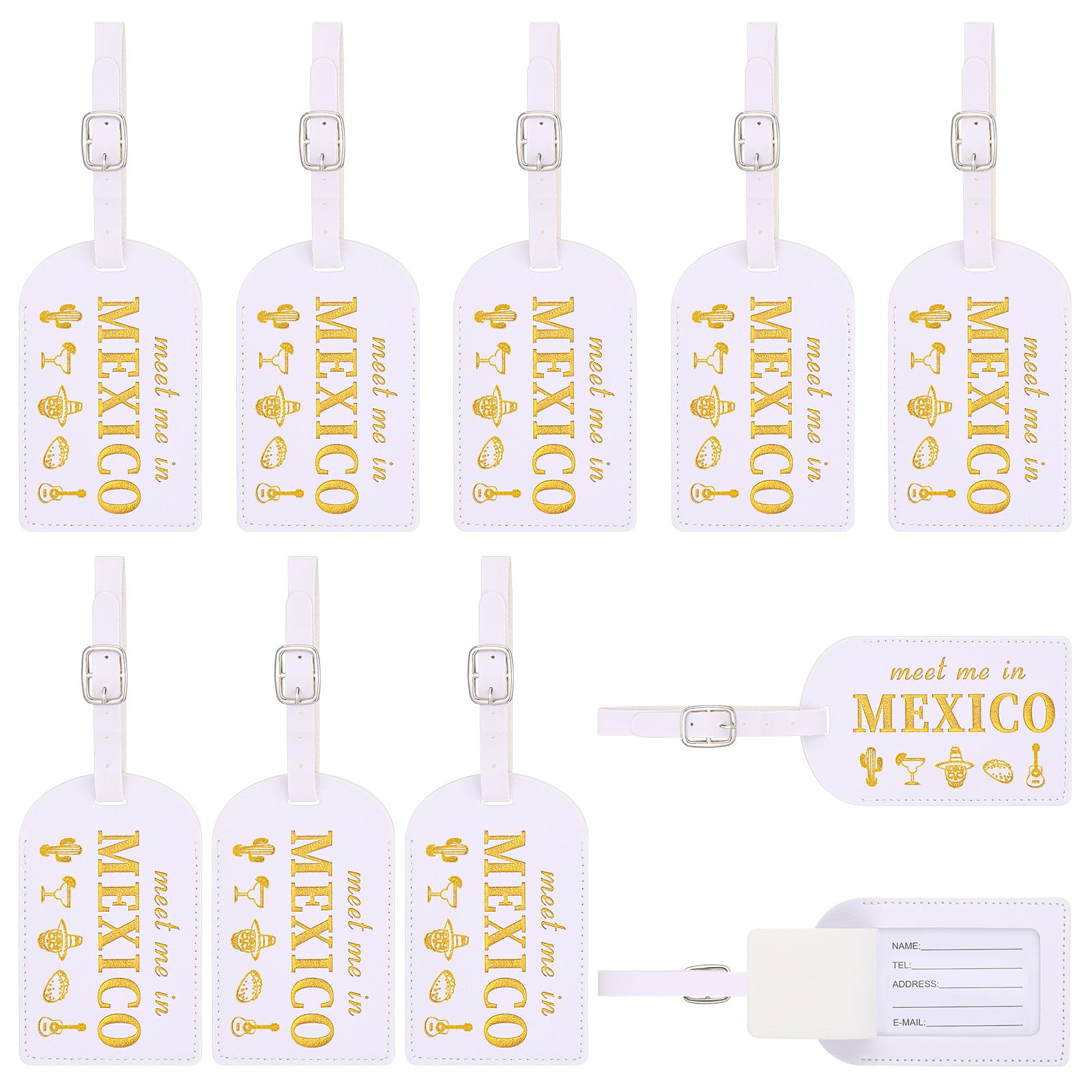Travel As You Wish: you will receive 8 white bridesmaid luggage tags, which are enough to meet your travel sharing needs and make your luggage more attractive and beautiful Material and Design: our white luggage tags are made of leather, with gold stamped text and printed with the words "Meet me in Mexico"; They are very romantic and memorable; The white luggage tags look harmonious and eye catching Ideal Size: measuring approximately 4.3 x 2.8 inches/ 11 x 7 cm, these cute luggage tags are suitably sized to be visible and easily identifiable, while not being cumbersome or intrusive on your luggage or handbags Heartfelt Gift: "Meet me in Mexico" is suitable for a Mexican destination wedding; These white luggage tags can be applied on suitcases, handbags, bags, wallets, backpacks, etc.; They are suitable for daily use, business travel, tourism, weddings and other activities to facilitate your identification of luggage Versatile Usage: these luggage tags are ideal gifts for bridal showers, bachelorette parties, honeymoons, anniversaries, birthdays and other occasions, and will be treasured for many years to come Features: Reminder to Adventure: Note that each time you see the phrase "Meet me in Mexico", it serves as a friendly reminder to embark on that next adventure. Indeed, as the saying goes, every day is a journey and the journey itself is home. A nice gift: These luggage tags make brilliant and thoughtful presents for bridal showers, bachelorette parties, anniversaries, birthdays, or as a honeymoon surprise. Their enduring charm ensures they will be cherished keepsakes for years to come. Specifications: Color: white Material: leather Size: about 4.3 x 2.8 inches/ 11 x 7 cm Package includes: 8 x White bridesmaid luggage tags Notes: Manual measurement, please allow slight errors on size. The color may exist a slight difference due to different screen displays.