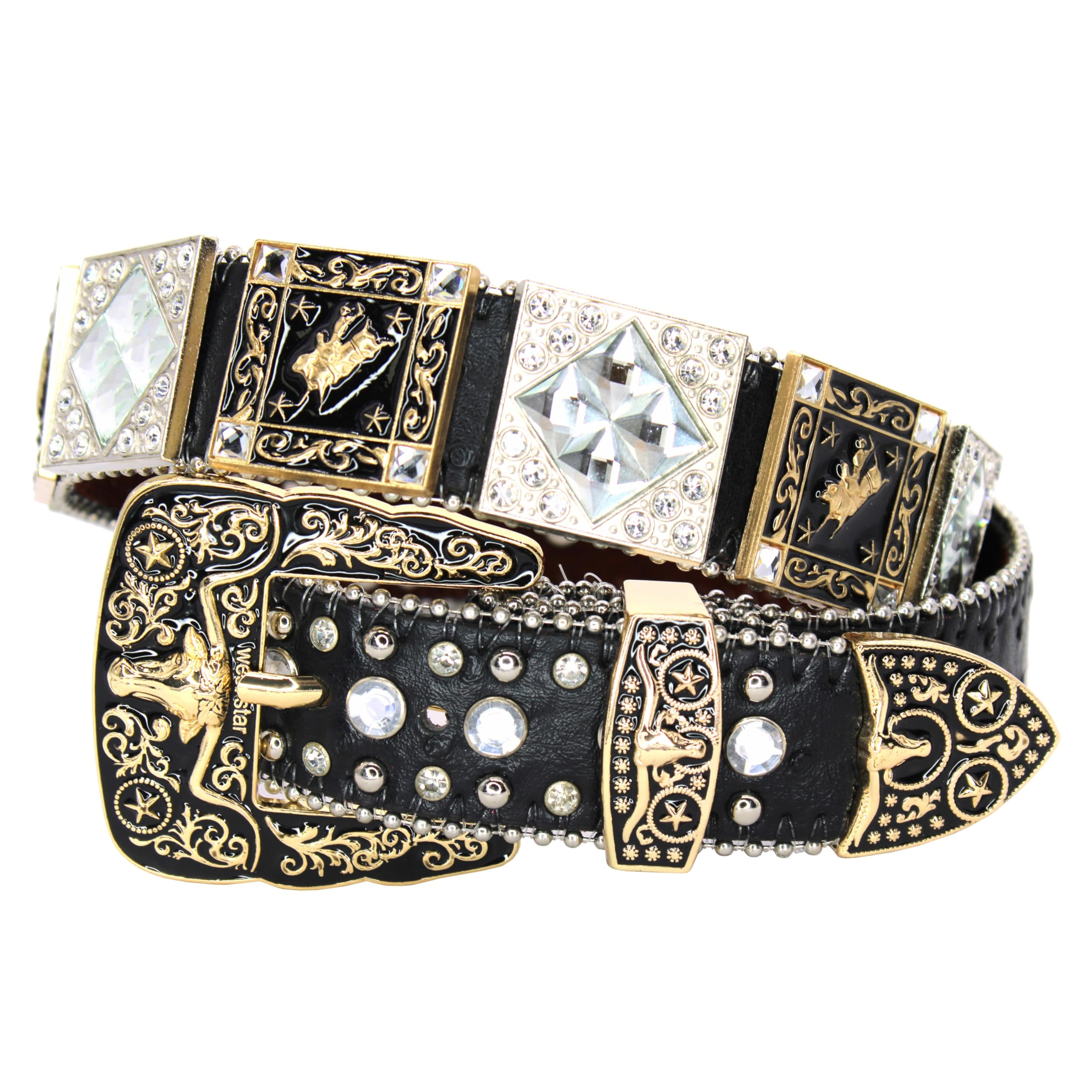 Premium Genuine Leather - Crafted from high-quality leather with a smooth backing for comfort, durability, and long-lasting wear. Sparkling Rhinestones & Crystal Studs - Bold crystals and shimmering accents give this belt eye-catching shine—perfect for country concerts, nights out, and everyday Western style. Engraved Western Buckle Set - Features an intricately engraved buckle, loop, and tip with classic Western details for a polished, statement-making look. Stylish for Women & Men - A versatile accessory that pairs effortlessly with jeans, dresses, skirts, shorts, or festival outfits—adds instant Western flair to any wardrobe. Ideal for Western Fashion - Perfect for cowgirl outfits, rodeo events, Nashville trips, country music festivals, or anyone who loves a stylish Western-inspired look. Bring bold Western style to your wardrobe with this Genuine Leather Rhinestone Belt from West Star Texas. Designed for both women and men, this belt delivers a perfect mix of fashion, sparkle, and classic Western influence. Each belt is crafted from durable genuine leather and accented with large rhinestones and crystal studs that create a striking, high-shine look. The engraved metal buckle set adds depth and character, featuring detailed Western artwork for a premium feel. Available in black or brown, and offered with several engraved designs—including horse, longhorn, cross, star and more - this belt makes it easy to match your personal style. Pair it effortlessly with jeans, dresses, or festival outfits to elevate your everyday look or create a standout Western-inspired ensemble. Ideal for rodeo events, country concerts, nights out, themed parties, or as a fashionable gift, this belt brings eye-catching charm and Western attitude to every outfit.