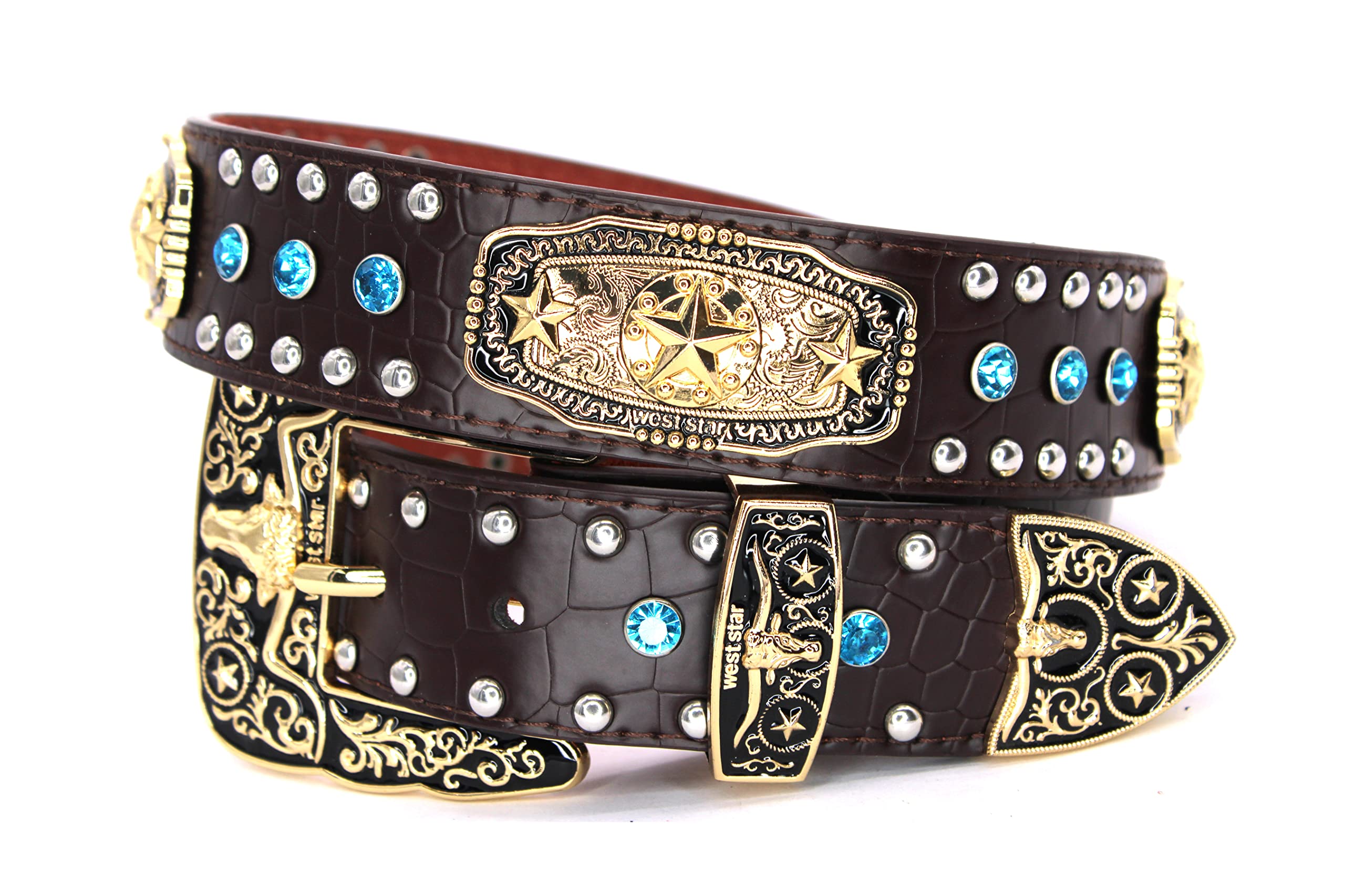 West Star Texas Western Belt - Genuine Leather Concho with Silver Studs & Rhinestones - Cowboy Rodeo Style