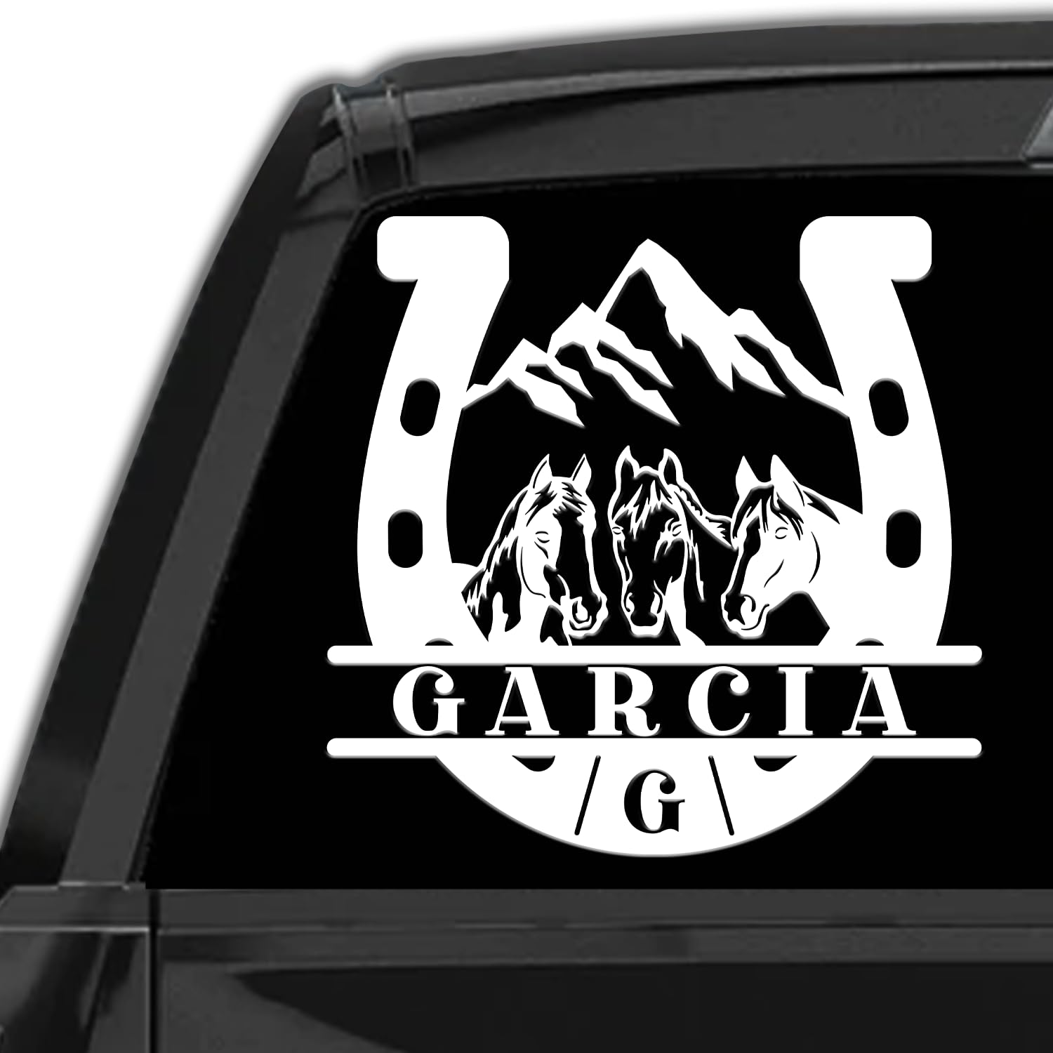 Calcomania personalizada con nombre o apellido. Diseño de rancho con herradura y caballos. Calcomania para Troca o Carro.