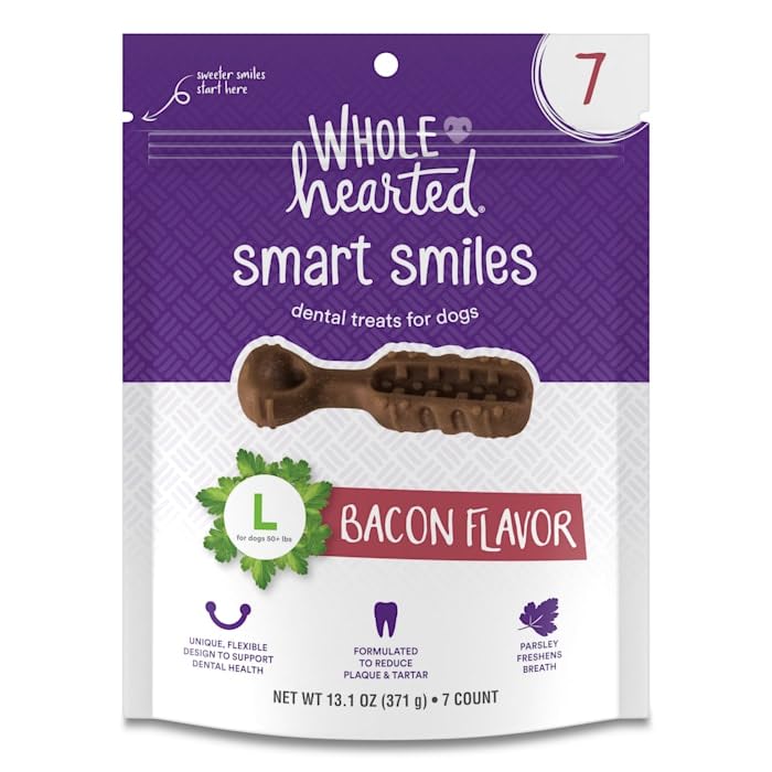 Smart Smiles Dental Treats from WholeHearted Formulated to reduce plaque and tartar Unique, flexible design to support dental health Made with ancient grain No artificial colors or flavors The Wholehearted Smart Smiles Dog Dental Treats make it easy to care for your dog's dental health from the comforts of home thanks to their delicious flavor, powerful ingredient blend, and flexible design. As these caninefavorite treats reduce plaque and tartar, they also freshen their breath with peppermint for more delightful kisses and upclose cuddles. Enjoy feeding them from the heart with these equally tasty and beneficial dental delights.