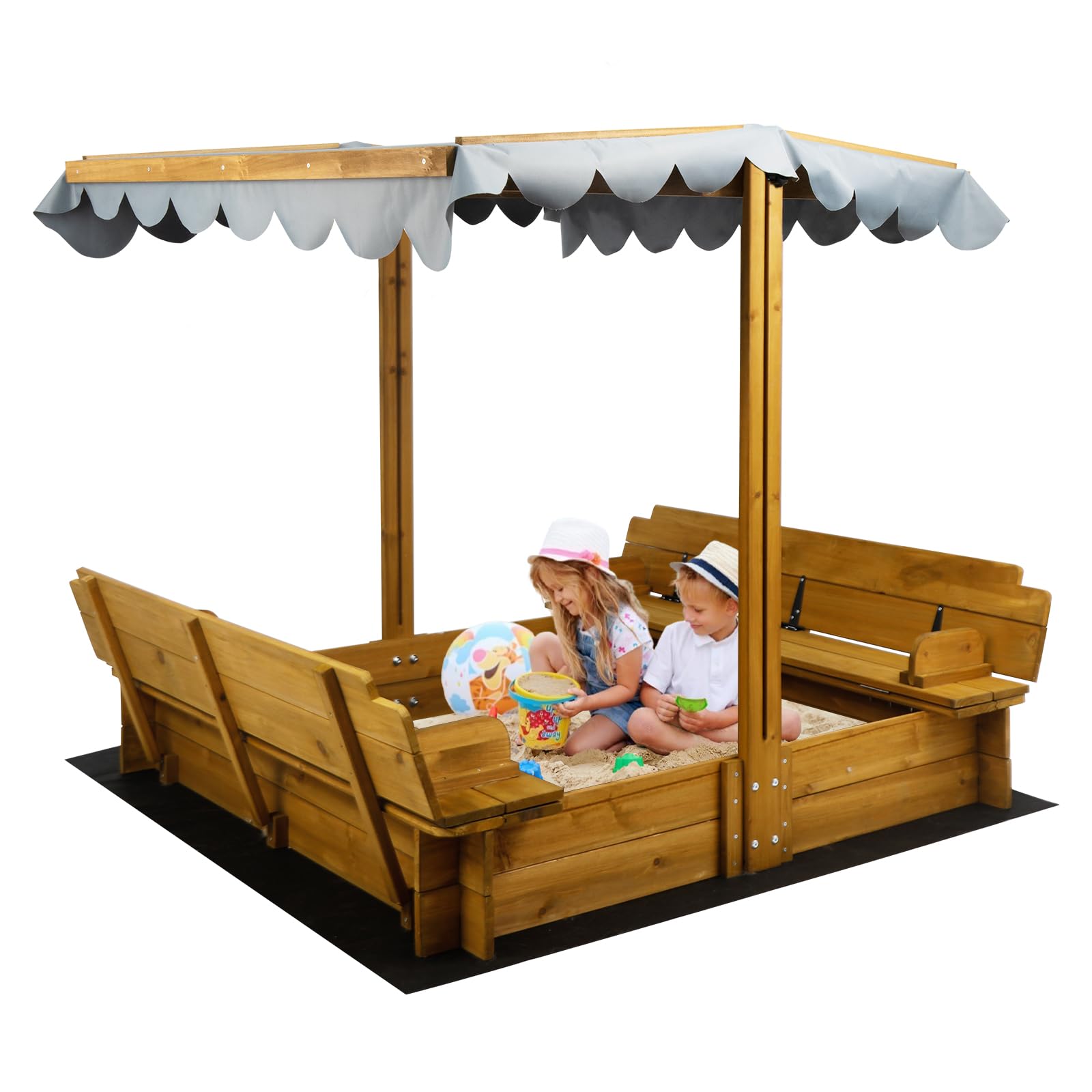 Play All Day-Rotating Canopy Sandbox-Keep playtime worry-free! Our kids sandbox features a 180°rotatable canopy and upgraded height adjusters—tilt or lower it to block harsh UV rays or sudden rain. When the fun’s done, simply drop the canopy to protect the san box from leaves, critters, or surprises. Overall Dimensions: 47.2" L x 47.2" W x 47.2" H. Drain-Friendly Design Liner-No soggy sand here! The bottomless san box lets air flow freely and drains rainwater fast. Added a non-woven liner to keep sand tidy and simplify cleanup. Built to Last-Premium Sandbox-Durable fun starts here! Crafted from polished, splinter-free fir wood, this outdoor sandbox with cover resists rot, weather, and wear. The lid transforms into two sturdy benches,holds 200 lbs! With rounded edges for safe sitting. No wobbly corners—just comfy spots. Safe for Play-Safety meets comfort! The smooth, barb-free wood panels protect little hands, while the T-shaped hinges lock the benches securely. Open the lid for playtime, close it to shield the san box from messes. Perfect for patios, gardens, or beach.It is a gift for children aged 2-8. Easy-Peasy Assembly-No toolbox headaches! Assemble this sandbox with canopy using just a screwdriver—everything’s included, from liners to step-by-step guides. Warm reminder:Sand and toys not included, but imaginations are! Give your kids the ultimate outdoor play experience with this versatile sandbox designed for endless fun and parent-approved convenience. The adjustable canopy rotates 180° and features upgraded side height adjusters, letting you customize sun protection or shield against surprise rain—just lower it post-play to guard the sand from debris and critters. Built to last, the sturdy fir wood construction boasts a smooth, splinter-free finish and weather-resistant durability. Assembly is a breeze—just grab a screwdriver and follow the included instructions to set it up in 30 minutes, complete with eco-friendly liners and panels. The clever lid transforms into two comfy benches with rounded edges (supports up to 200 lbs!), giving kids a safe spot to rest those sandy knees, while the bottomless design paired with a breathable non-woven liner promotes quick drainage and adjustable sand depth. Perfect for patios, gardens, or beach days, so your kids can dig, build, and imagine without limits. (Note: Sand and toys not included—let their creativity fill the space!)