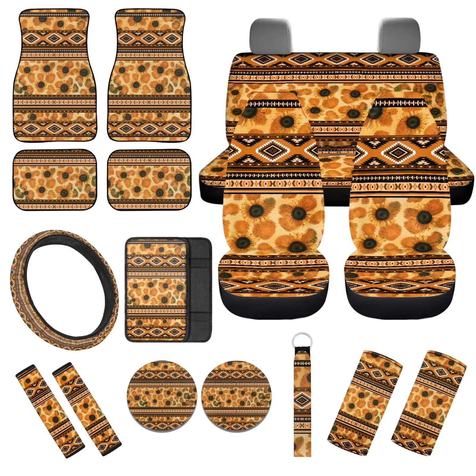 Wunvihay Aztec Style Sunflower and Cow Patterns 17 Pcs Car Seat Covers Full Set Car Floor Mats Steering Wheel Cover Seat Belt Pad for Sedans Trucks