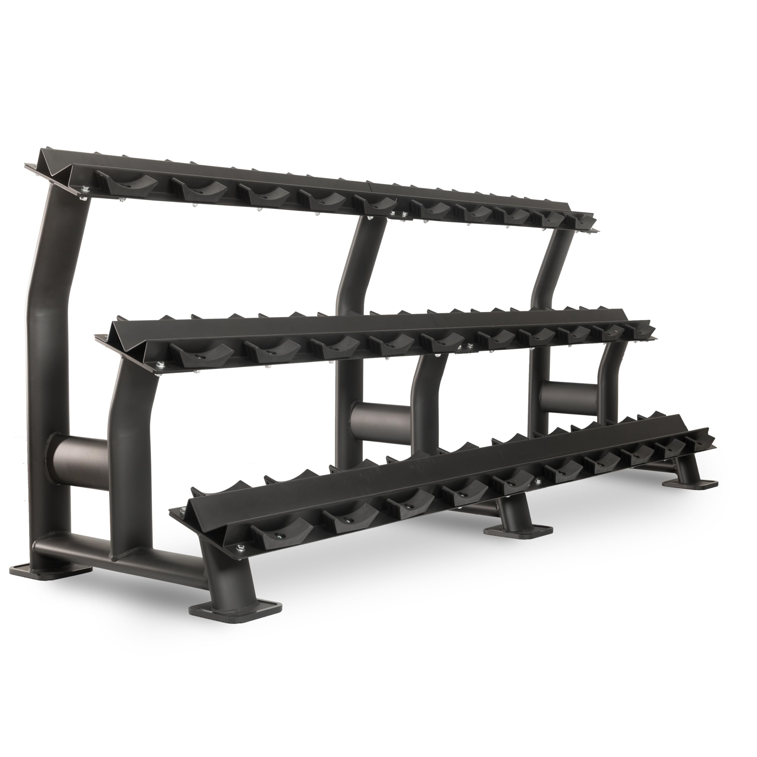 COMMERCIAL STRENGTH: When it comes to commercial exercise equipment, durability is everything. That's why the XMARK 3-Tier Commercial Dumbbell Rack is crafted from high-grade, 11-gauge steel which is able to handle the rigors of daily repeated use in serious strength training environments. CLASSIC STYLE RACK: This commercial rack neatly stores up to 15 pairs of dumbbells ranging from 5 to 110 lbs with a clean, classic design. DUMBBELLS SECURED: No more chasing weights. Our dumbbell storage rack features individual saddles which cradle each dumbbell, preventing them from rolling. This secure design minimizes nicks and scratches to your dumbbells while keeping your gym safe and organized. EXTREME WEIGHT CAPACITY: This rack weighs a whopping 252 pounds and accommodates round, 12-sided, and prostyle dumbbells up to a total weight capacity of 2,000 pounds. SPACE-SAVER DESIGN: The compact 3-tier layout of this rack is specially designed to maximize the floor space in your gym and keep your workout area clutter-free. ROCK-SOLID STABILITY: Welded padded feet absorb impact and ensure stability during heavy use, shielding your floors and preventing wobbling or tipping even under the heaviest loads. Take your weight training setup to the next level with the XMARK 3-Tier Commercial Dumbbell Rack, designed to handle the tough demands of serious strength training environments. Crafted from heavy-duty 11-gauge steel, this rugged rack is built to last, capable of neatly storing up to 15 pairs of dumbbells while keeping your gym space orderly and free of clutter. Its strong frame and reliable dumbbell saddles ensure that each piece of equipment stays securely in place, even during your most grueling workouts. This means you can stay focused on your training without any worries about interruptions or safety issues. The generous spacing between the dumbbell saddles accommodates round, 12-sided, and prostyle dumbbells. When you invest in the XMARK 3-Tier Commercial Dumbbell Rack, you're choosing a durable and high-performance solution tailored for gyms that value safety, organization, and top-notch workout equipment. Built for exceptional sturdiness and longevity, this rack promises to be a wise investment that delivers reliable service for years to come.