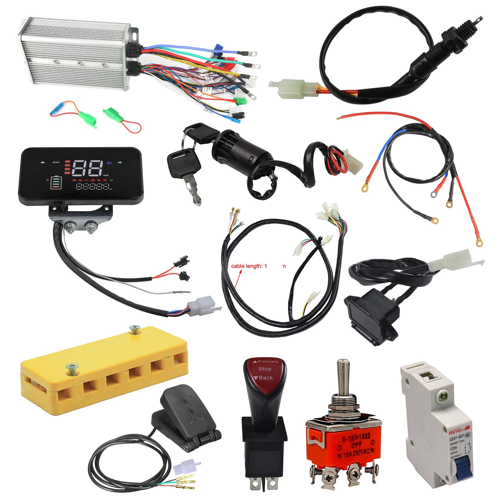 Package includes 1x Speed Controller + 1x LCD display + 1x throttle pedal+ 1xCharging port +1x battery connecting wire+ 1x terminal board+ 1x air switch +1x wiring harness + 1x key on off switch + 1x 3 speed toggle switch +1x reverse forward switch+ 1x brake switch