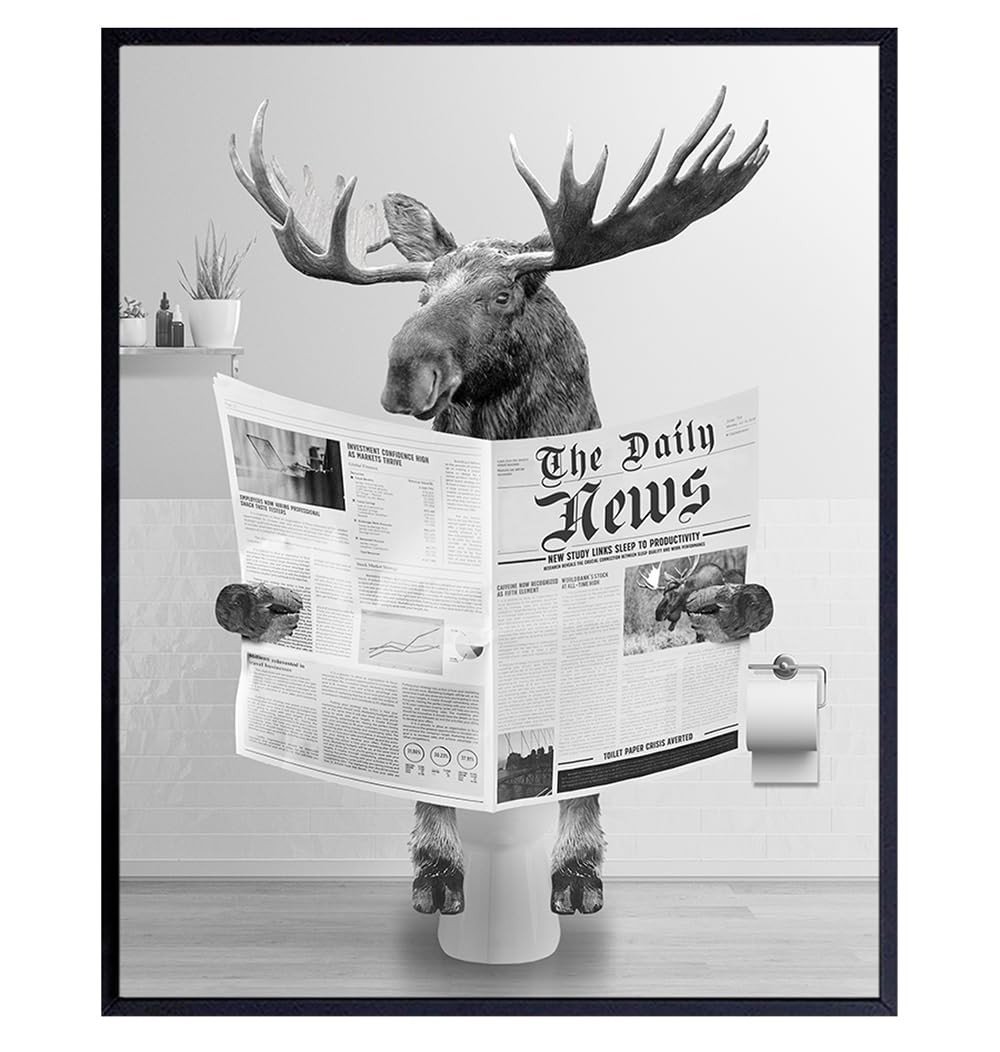YELLOWBIRD ART & DESIGN Moose Bathroom Accessories for Men - Cute funny Gray Small Bathroom Wall Art & Decor - Powder room Pictures - Modern Bath