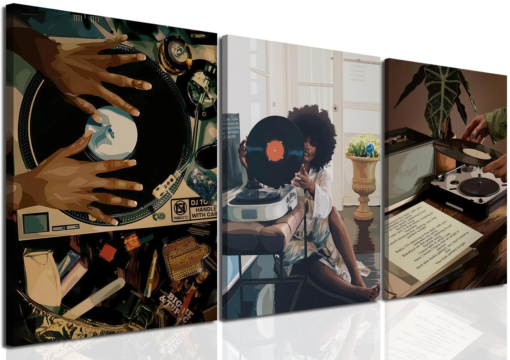 Modern Black Girl Wall Decor: This YFvrpt black girl wall art features stylish African American women with trendy artistic details, record player elements, and modern fashion-inspired designs that bring personality and aesthetic charm to any room; the black girl and music record player create a fashionable statement piece perfect for elevating bedroom, living room, or dorm decor with contemporary Black woman artwork and music-inspired visuals Modern Black Art Wall Decor: Each woman painting wall art measures 12x16 inches and comes professionally framed in a sleek black frame, offering a polished gallery-style look; the vertical layout fits beautifully in bedrooms, living rooms, hallways, apartments, and small or large gallery wall setups, making it easy to decorate modern spaces with coordinated black girl wall art Black Girl Wall Art: Perfect for modern bedrooms, fashion-themed living rooms, music corners, teen rooms, home studios, and apartments, this black people artwork blends stylish woman illustrations with bold personality; the music record player theme, expressive poses, and modern design make it ideal for creating a trendy atmosphere in contemporary, eclectic, or chic home decor styles Black African American Wall Art: This Black girl artwork set makes a meaningful and stylish gift for women, friends, daughters, students, or anyone who loves aesthetic wall décor; ideal for birthdays, holidays, housewarming parties, graduations, or as a unique room refresh gift, this set of 3 black woman canvas wall decor adds beauty, fashion, and modern to any space African American Room Decor: These black woman wall art are perfect for a variety of spaces, including bedrooms, living rooms, or even as hip wall decor in a music studio or office. The bold, fashion-forward designs blend well with modern, eclectic, or urban styles