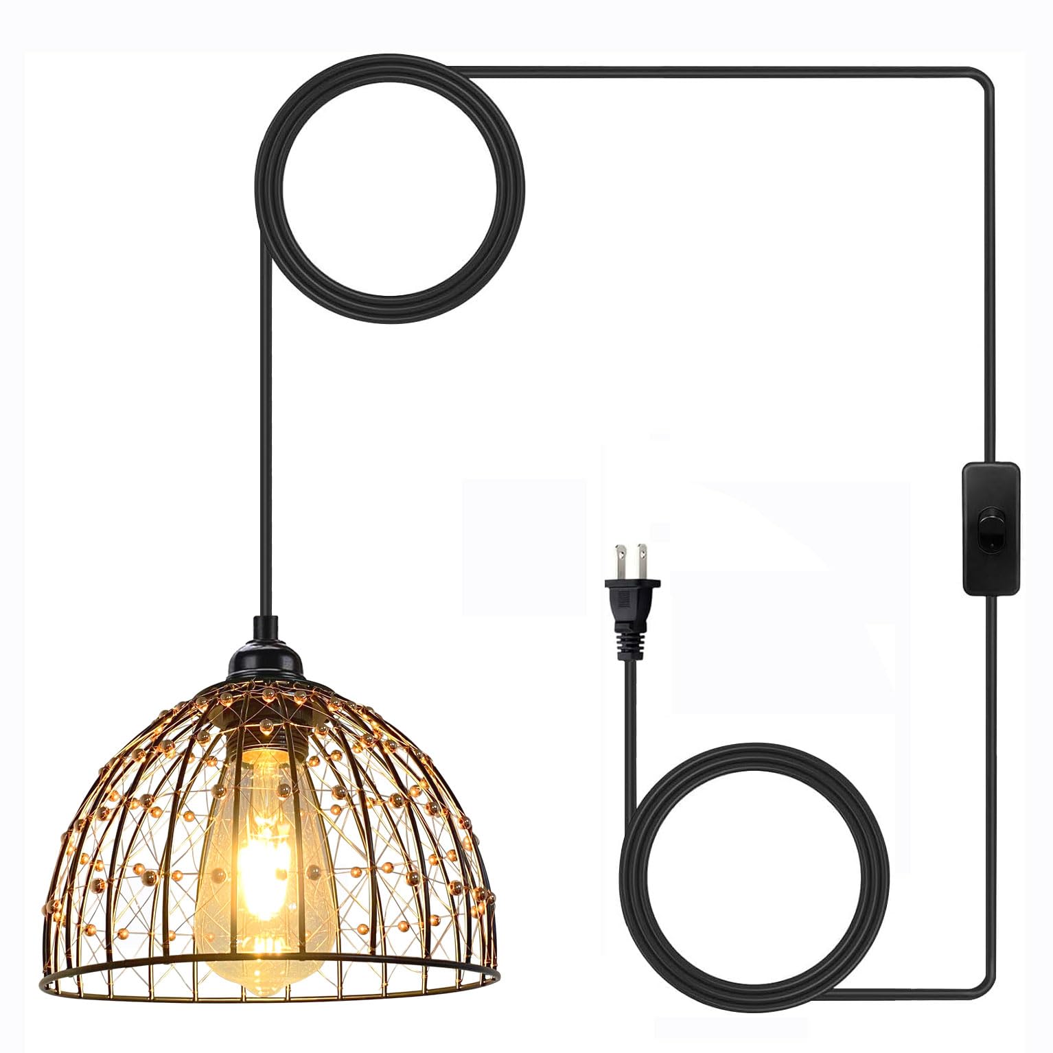 Industrial Vintage Hanging Lamp - The Plug in pendant light kits are made of 15ft high quality black PVC waterproof cable and metal Dome Lampshade for more durability. Not easy to break. The metal light line is wrapped in golden thread and open-air design of the cage lampshade, it not only protects the bulb, but also maximizes the light emission. it combines two classic elements of modern industry and retro vintage. Light up more amazing for your Home Decoration Light Fixtures Dimension - Metal Dome Shade Height 15cm(5.91"). Metal Dome Shade Diameter 20cm(7.87") . Adjustable Black Cord Length 15ft (4.5M). Power Plug Type US Plug. Input Voltage 110V. The hanging lights with plug in cord fits standard E26 incandescent bulbs, CFL bulbs and LED bulbs, bulb is NOT included. Recommended maximum per bulb power 60W Metal Wire Dome Lamp Shades - Φ7.87 inch. The pendant lantern lights are adorned with beaded copper wire ball that add a touch of elegance and sophistication. The copper wire adds a warm and rustic appearance, enhancing the overall aesthetic of your outdoor space, fine workmanship. Its unique design softly illuminates your pavilion on the porch or terrace. Adjustable Length and ON/OFF Switch - With 15feet extension cord, you can adjust the length of the light fixture as you want. Easy to install without any tools, just screw in the bulb, plug in and easily control the light/off switch.Designed with durable metal and 15ft adjustable Hemp Rope wire, offers high quality and warm hanging lights for hallways, bedrooms, kitchen, living room or anywhere in your home Widely Used Hanging Lighting Fixture - This Pendant Light is an ideal fixture for providing creativity and welcoming to your Kitchen or Home. You can place this alone or you can add them in groups. Furthermore, nsformed into a table lamp, a pendant light, a ceiling fixture, or a wall-mounted lamp. Suitable for the bar, island, kitchen, loft , dining room, study, bedroom and more